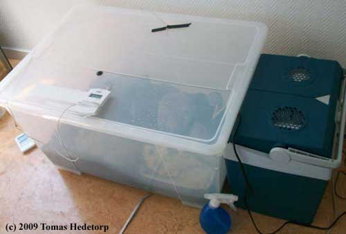 An ordinary cooler can be used to cool a terrarium. The components used here are: small cooler, PVC pipe, two computer fans, and ice or ice packs. For construction details, see original forum post.