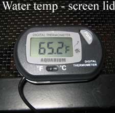 The temperature readings shown below were taken in 2 nearly-identical aquariums that sit side-by-side on a table. Both tanks are the same size and have bubblers only (no motorized filter). Because of evaporation, the water temperature in the tank with a screen lid is more than 3°F cooler than the ambient air! The advantages of this method are that it requires no effort and poses no risk of malfunction.