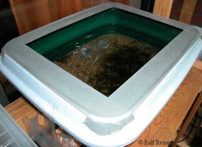 Yes In this unusual example, a cat litter box was used as a temporary tank. Duct tape was used to create a wide rim to prevent escape. |