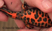 P. chinensis. In breeding season, the male has an enlarged cloaca (below left), while the female has a volcano-shaped cloaca (below, right). The male gets a blue-white tail stripe during breeding season (below, center).