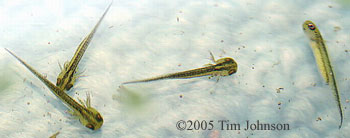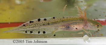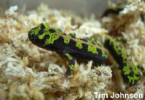 The eggs and the larvae should be maintained at a similar temperature to that of the breeding aquarium. As mentioned above, expect to lose 50% at tail-bud formation due to a chromosome problem that these newts have. The eggs are unpigmented, and they usually hatch 14-21 days after laying. The 8-10 mm larvae are very pale cream or white in colour, with two dark bands running lengthwise from the head onto the tail, one on either side of the dorsal fin. After yolk absorption (3 days or so), the larvae become active mid-water predators, and live food is essential (young Daphnia, newly hatched brine shrimp/Artemia, ostracods, Cyclops, etc). Growth is rapid, and metamorphosis is usually reached at between 8 and 10 weeks if fed well. Metamorphs of the nominate form are typically 5-8 cm, while those of the Pygmy form are noticeably smaller. The metamorphs can be raised on gut-loaded hatchling crickets, white worms and fruitflies. Sexual maturity in captivity typically takes 2-4 years.