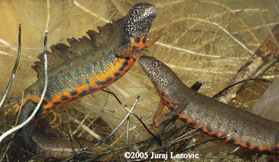 The crested newts are large (up to 18 cm; 7 inches) heavily-built newts. They have a somewhat warty skin, quite unlike the smooth or granular skin of smaller species, such as the Mesotriton and Lissotriton. The back is dark brown or black, and there may be white stippling along the flanks. The belly is usually yellow or orange, with large black blotches or spots. The males develop a high, toothed, crest during the breeding season, and a white band along each side of the tail.