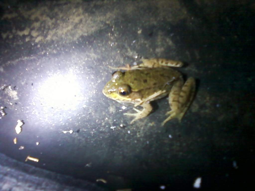 Few plain spots, thin cross bars on legs, dorsolateral ridges - Green frog. Leopard frog group has more distinctive spots, different leg pattern, longer snout. Bullfrogs have less distinct markings, but are easily excluded because they lack dorsolateral ridges.