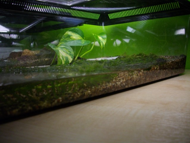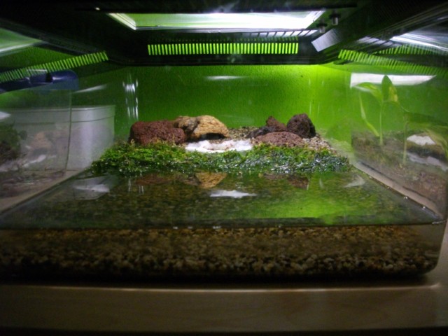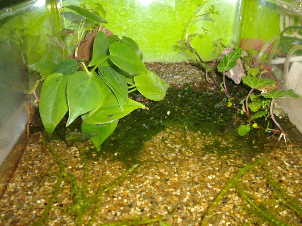 I'm working on getting my tank set up with the plan of moving my CP larva into it once they get too big for the tub they are in now (so when they're close to metamorphosis). I think there is enough water in there for them, but also there is the driftwood for them to crawl out on and then the three ceramic pots will be the land area. One as you can see has plants, the other two will hold a hide and the feeding bowl.
