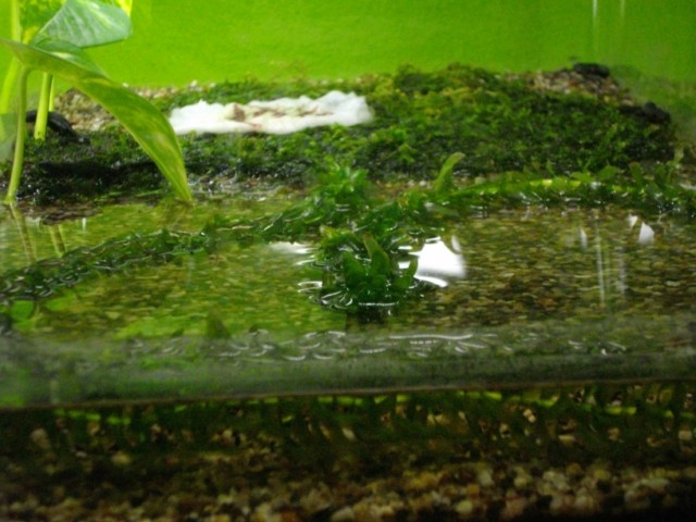 I'm also having trouble figuring out the land area. The three pots are mostly full of gravel to weigh them down. The 2 plants are in small pots and I have packed coconut fibre around them with large stones on top. I'm dubious about the coconut fibre though. I know people use it but its so loose and springy, how could the newts walk on it? Am I better to just have the gravel on its own - or with some moss maybe?