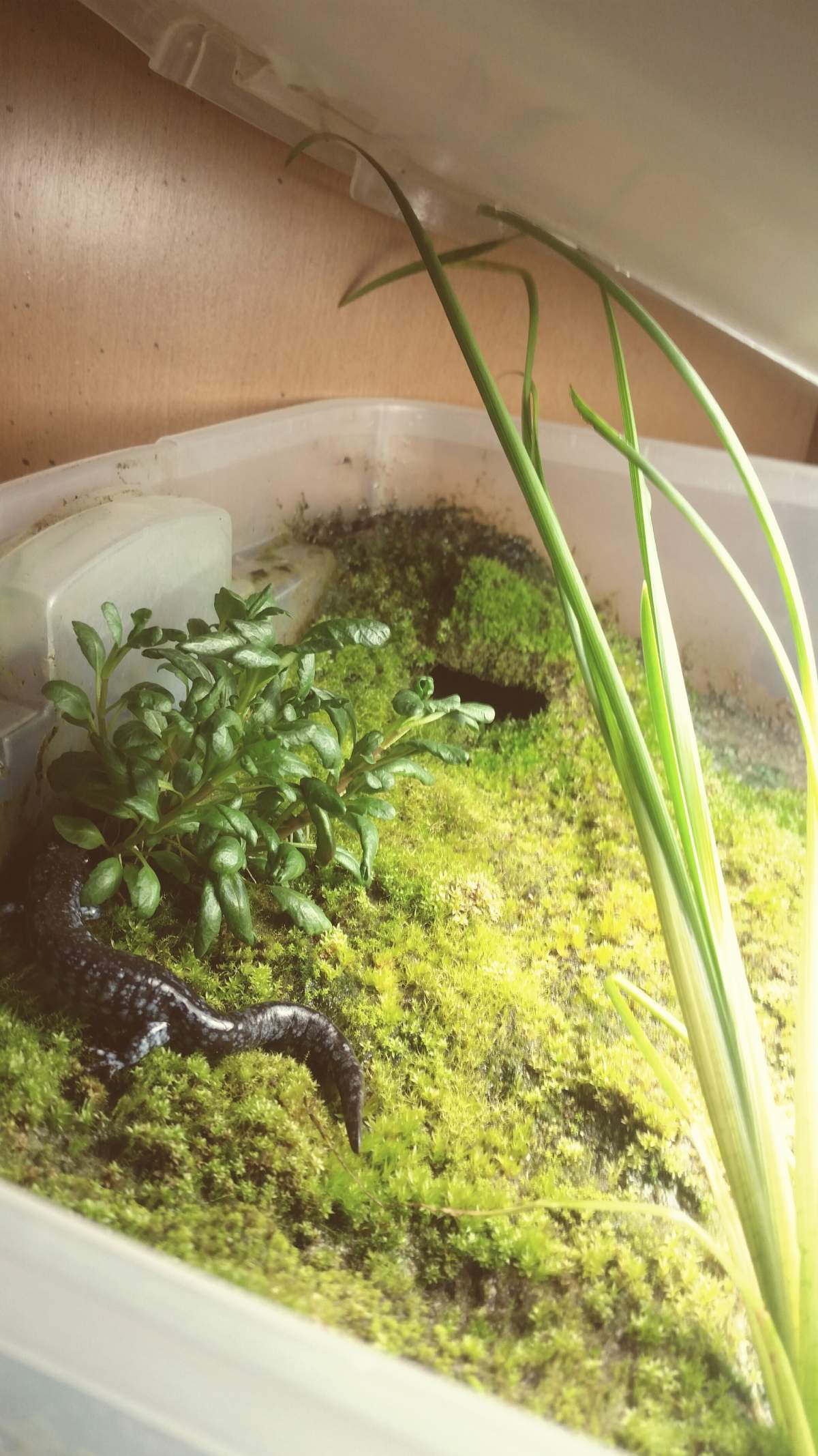 It's finally filled in with a plant a grass patch and a moss carpet. I made two caves out of water bottle bottoms which moss grew over intentionally. There's also a dividing wall of plastic which the salamander loves to go under. On the other side of the wall are some rocks and an air stone kind of buried to keep the water sprinkling over all the time Also the oxygen in the water I've read is good for the salamander and plants. The lights are on a timer of 10 or 11 hours of light Per day. I didn't even plant any of those plants they all just started growing and then I fragmented the moss so it would fill in where I wanted.