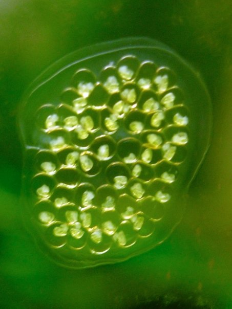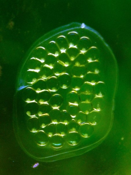 I have pinpoint clear bubbles inside gelatineous masses on the side od my tank glass. There is one mass where the pin points are larger and white. Are these eggs, spermatofore, something else?