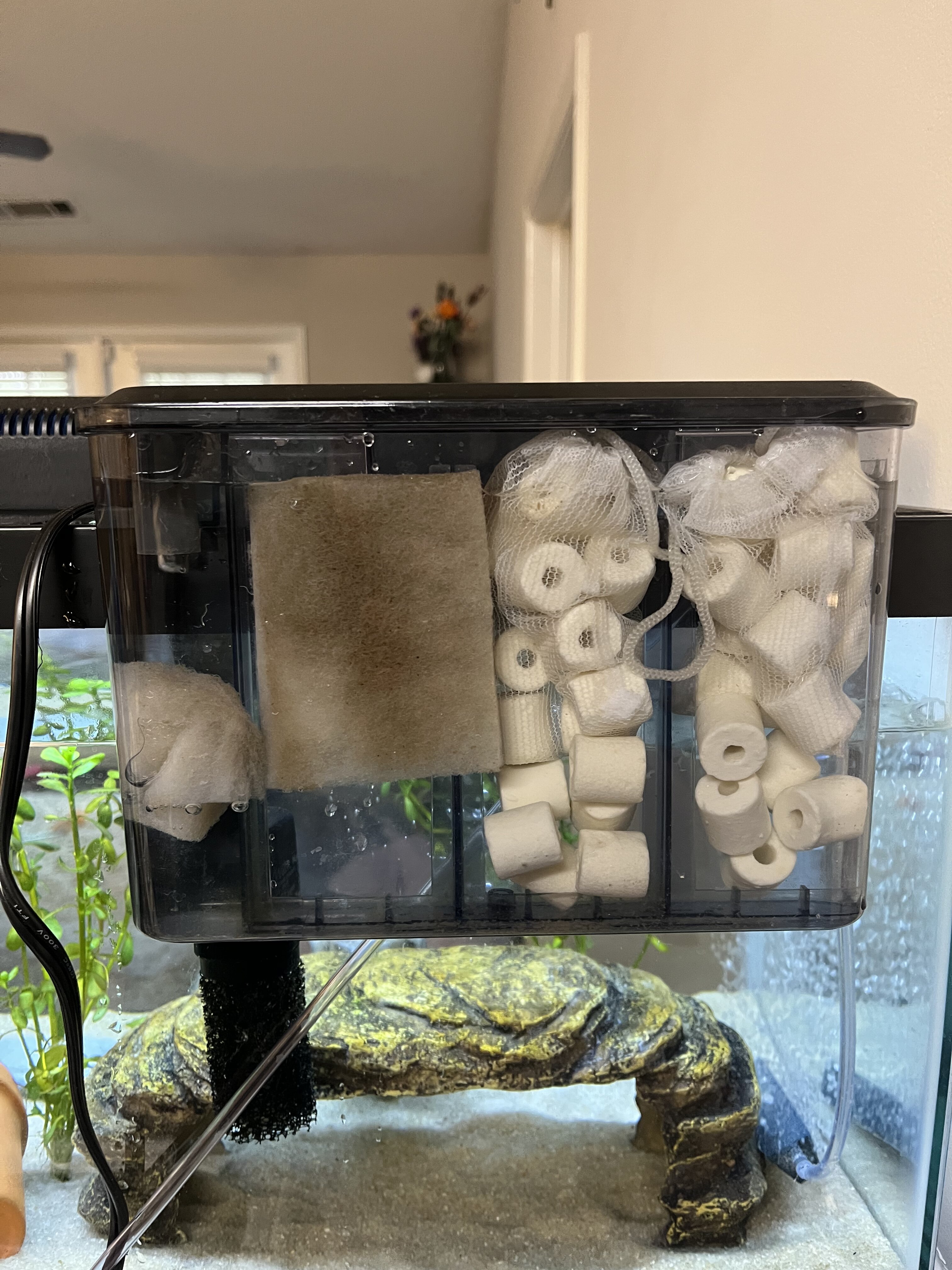 This is what I did for his filter. I also have a few rings wrapped in the pad in the first slot. As for the pH, it has been reading at 7.4 minimum every time I have checked it. I don’t check every day but I check often. Today it is reading at 6ph?? I have no idea how it could even be so low. Do the bacteria lower ph or something? or is my test kit faulty. I’m still suspicious after my nitrate test went from 80 to 20 overnight then back to 80.