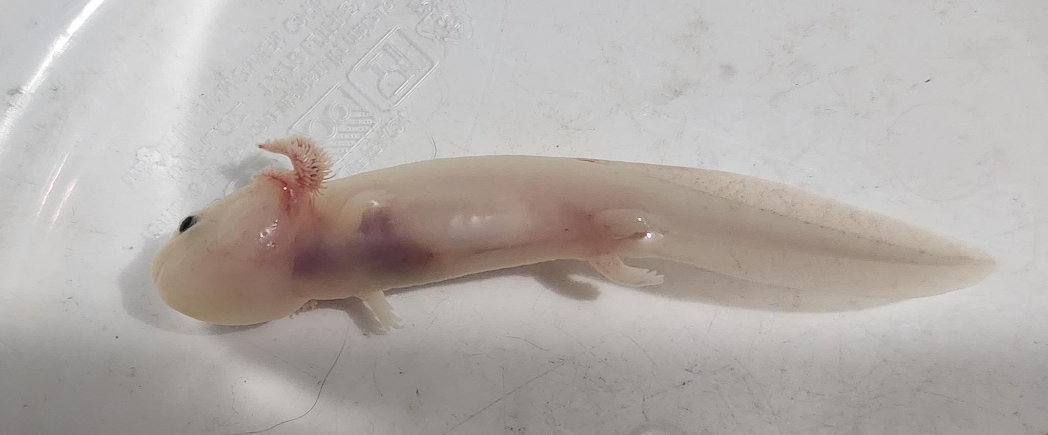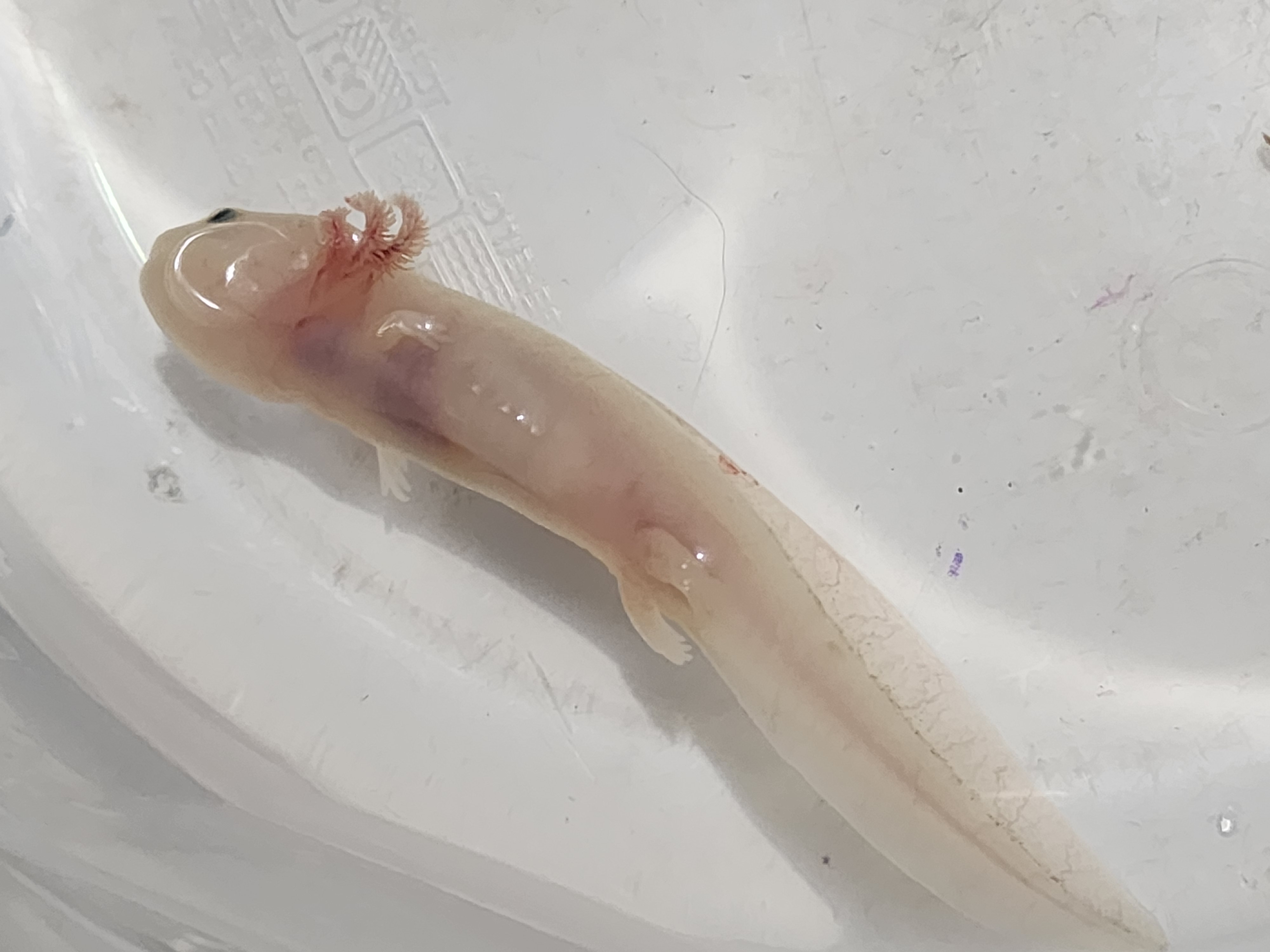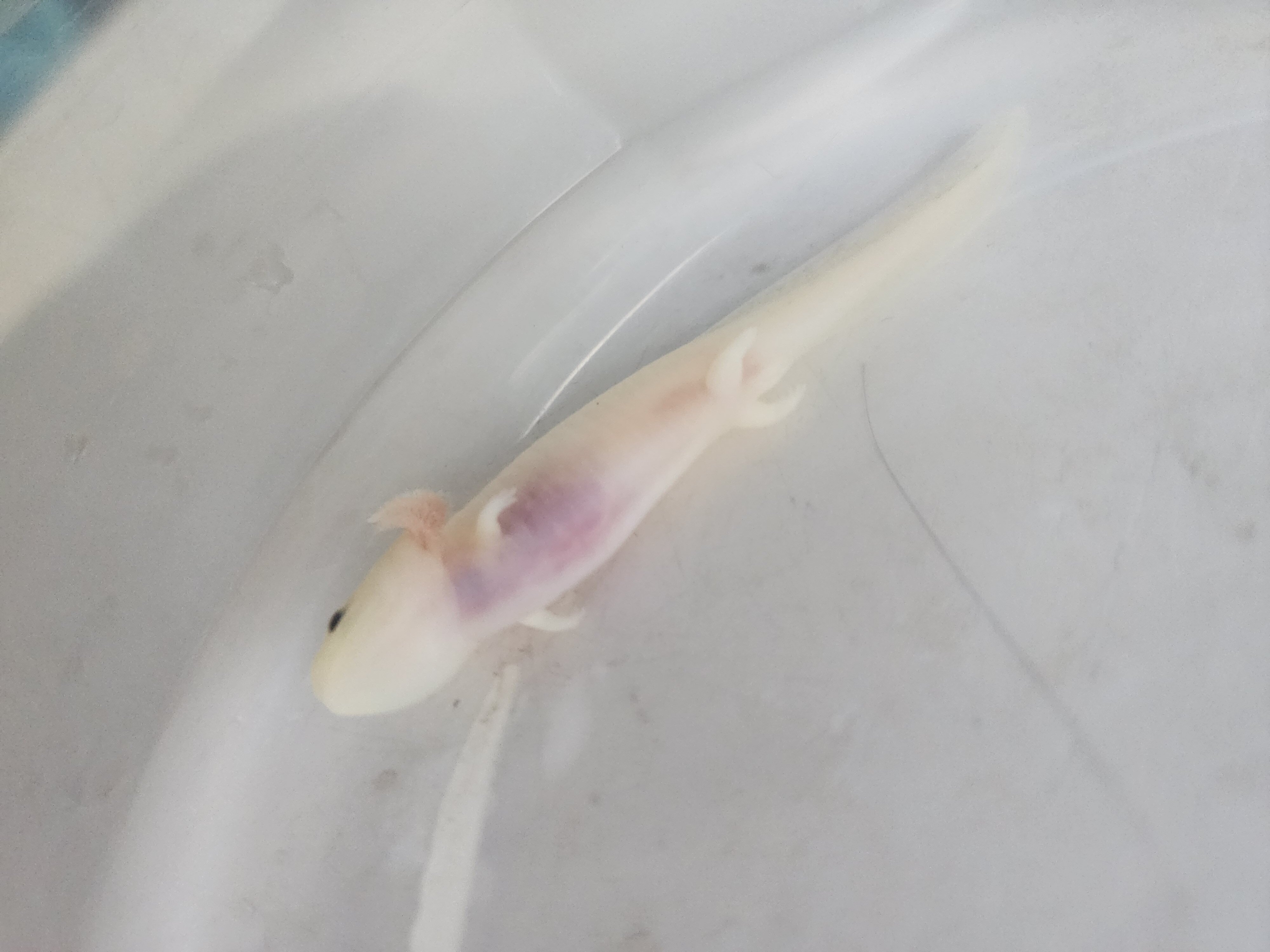Last week I went for pm water change and it was upside down at the bottom of the tub. Not floating. It was lightly blushed in color and very veiny looking. I changed water and it thrashed about a bit. It did not eat that night. It was laying sorta on it's side in the morning and did eat that morning. That was it's last meal and it stopped eating. I read that lowering the water level so it could be right side up would help reduce stress so I did that. It hasn't eaten in days. I tried to increase water level and it lays flat in it's side and you can see the air bubble in its abdomen. So I lowered the water back so that it would be right side up. It's stomach is completely clear. The red veiny lines went away and its overall looking rather pale. I noticed at one point a couple days ago a dark spot in its throat. It's stomach was empty. Over the past couple days still not eating but seems to right itself better when stimulated. The dark spot is growing exponentially on the inside. From the throat down now into the mid section. I thought maybe it was eating. But I've been more meticulous about counting the worms and it is not food. It's hard to capture in photos but I'll try to share what I have. It's so weird like it looks like it's pooling full of blood on the inside. There was no trauma or rough handling. Everythings been pretty consistent. With the increase in size of the dark spot, paleness of the body, and overall lethargy. I think he might be a goner. Attached pictures were taken over the course of the past week. The larger the dark bruised spot, the more recent the photos. It is in freshly changed clean water in the photos, any discoloration is from the surface underneath.