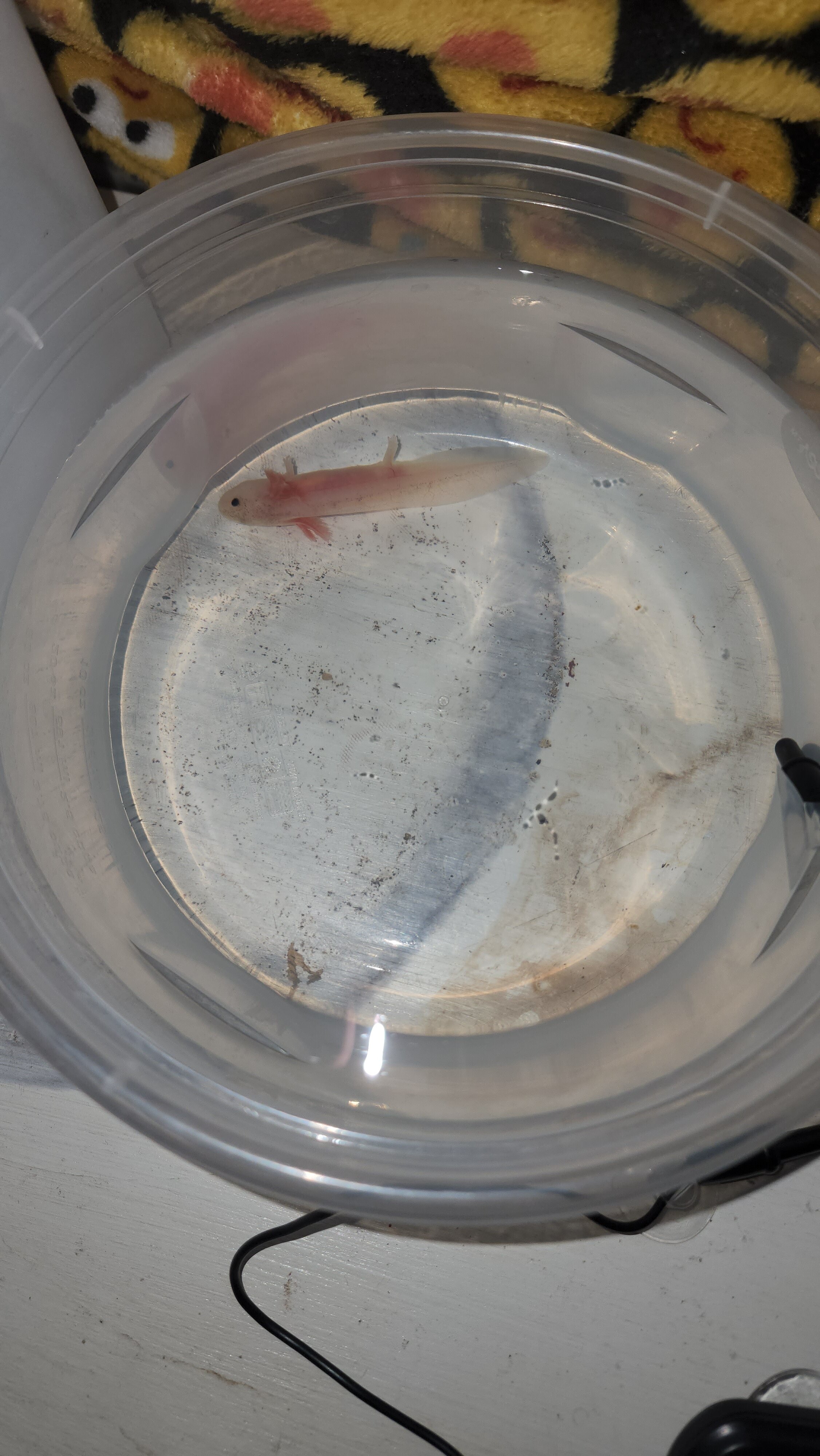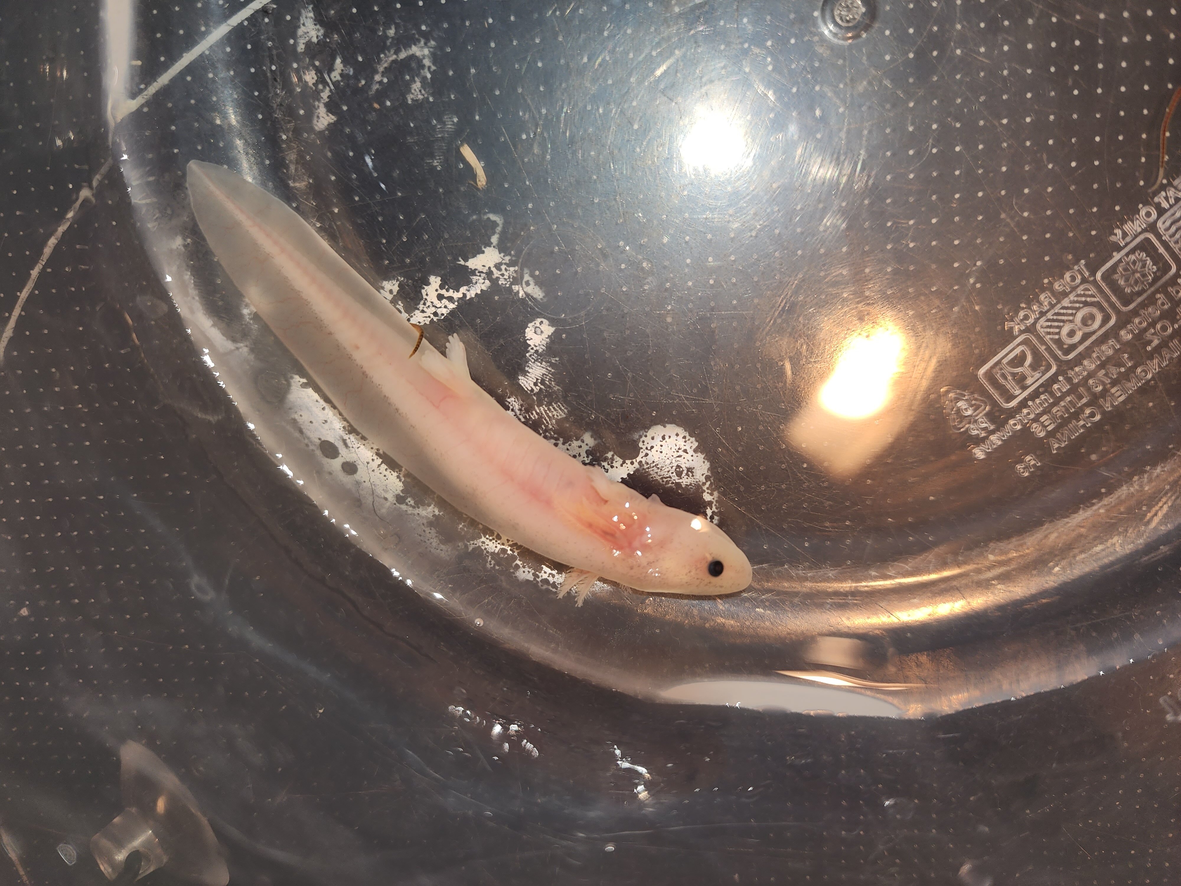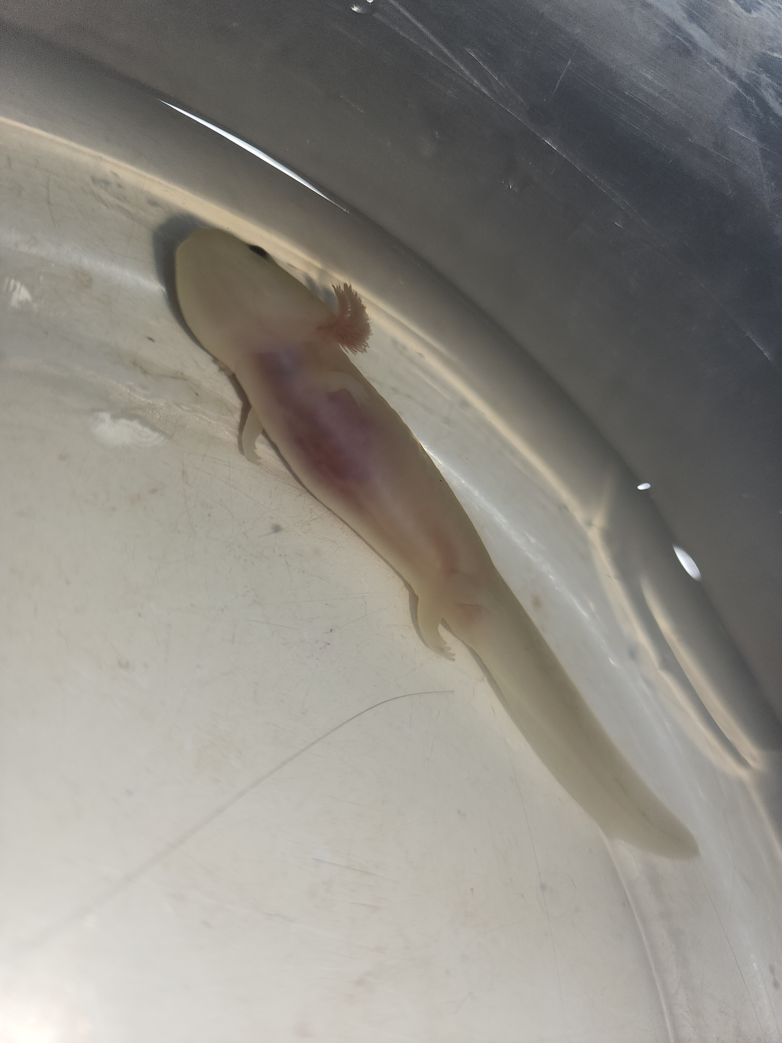 Last week I went for pm water change and it was upside down at the bottom of the tub. Not floating. It was lightly blushed in color and very veiny looking. I changed water and it thrashed about a bit. It did not eat that night. It was laying sorta on it's side in the morning and did eat that morning. That was it's last meal and it stopped eating. I read that lowering the water level so it could be right side up would help reduce stress so I did that. It hasn't eaten in days. I tried to increase water level and it lays flat in it's side and you can see the air bubble in its abdomen. So I lowered the water back so that it would be right side up. It's stomach is completely clear. The red veiny lines went away and its overall looking rather pale. I noticed at one point a couple days ago a dark spot in its throat. It's stomach was empty. Over the past couple days still not eating but seems to right itself better when stimulated. The dark spot is growing exponentially on the inside. From the throat down now into the mid section. I thought maybe it was eating. But I've been more meticulous about counting the worms and it is not food. It's hard to capture in photos but I'll try to share what I have. It's so weird like it looks like it's pooling full of blood on the inside. There was no trauma or rough handling. Everythings been pretty consistent. With the increase in size of the dark spot, paleness of the body, and overall lethargy. I think he might be a goner. Attached pictures were taken over the course of the past week. The larger the dark bruised spot, the more recent the photos. It is in freshly changed clean water in the photos, any discoloration is from the surface underneath.
