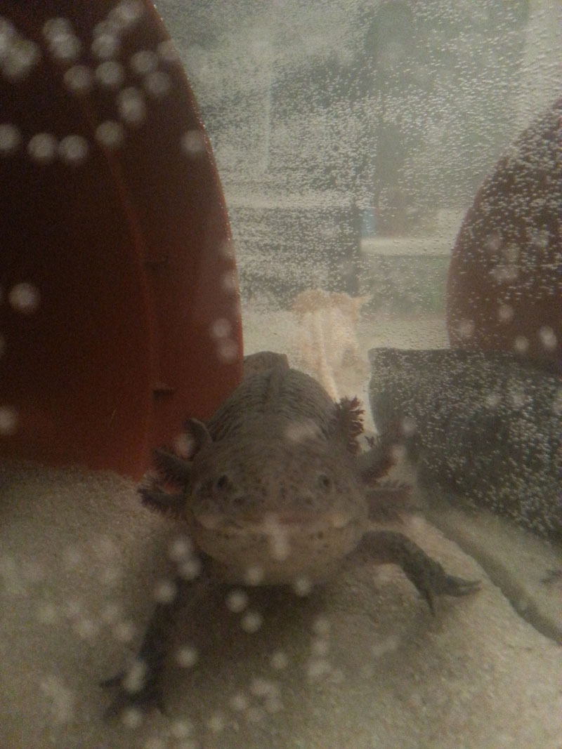 Some time after I let him into the new aquarium, I noticed that his gills seem to have shrunk. More specifically, the feathery bits seemed to have almost completely disappeared).