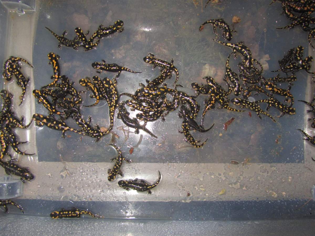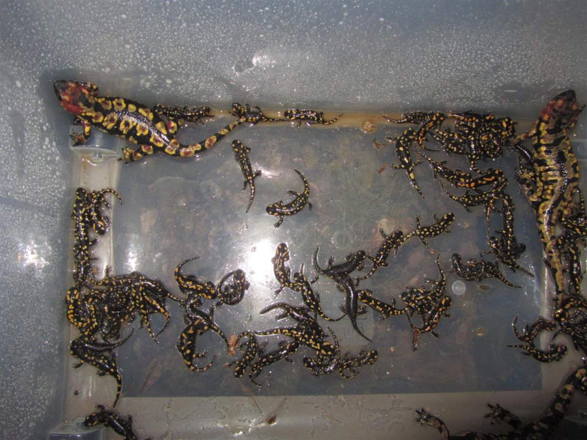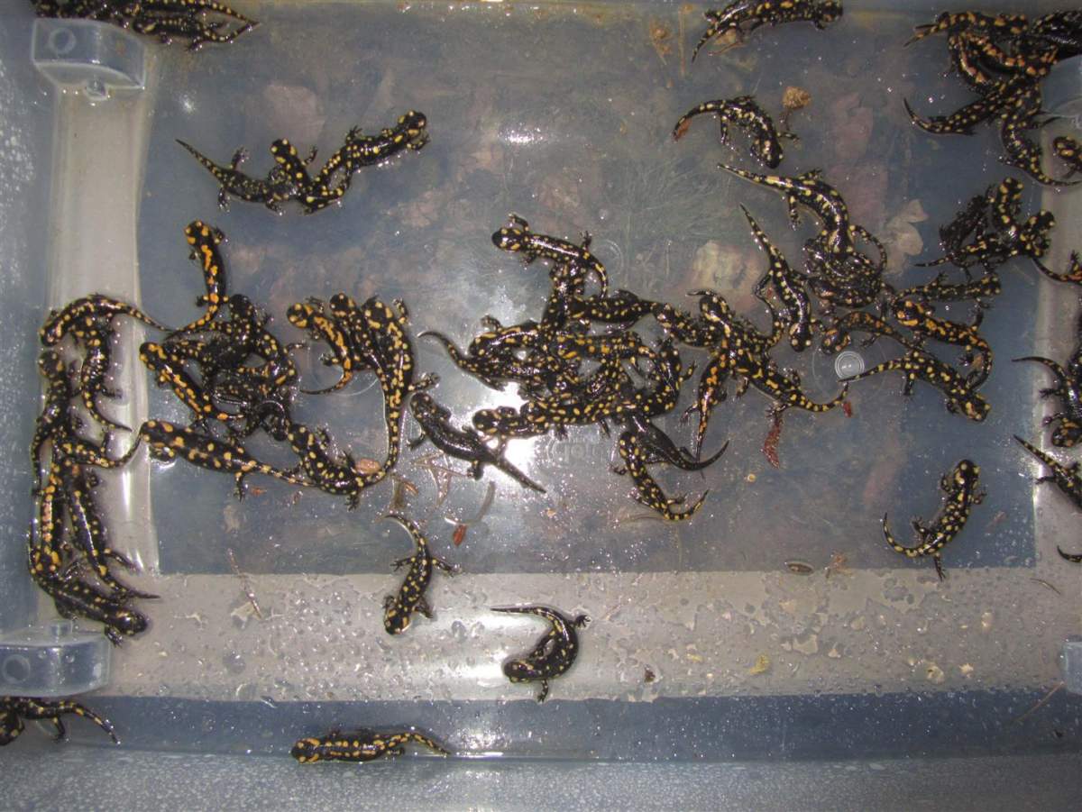 I got 2008 freshly metamorphosed very small salamander and they bred for the first time on 20 October 2012, than the first larvae was born, and so they now look: beautiful,