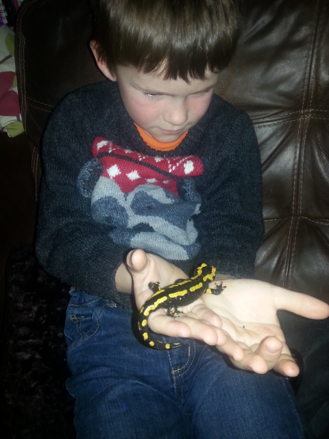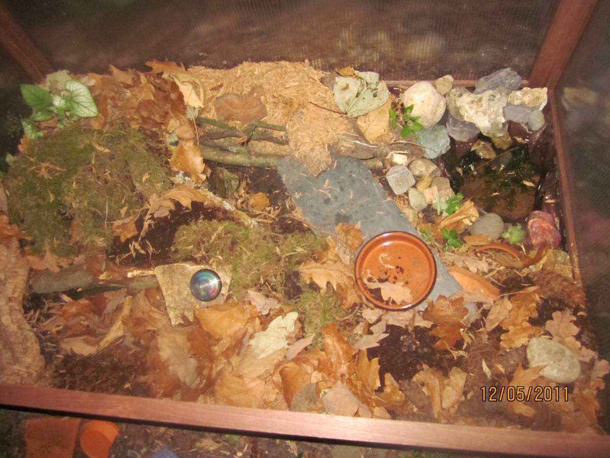 They are approx 4 cm long and kept in a simple tank, with damp paper towels some broken plant pot and some plant. I have a larger one ready for them, but they seemed too small. I also wanted to make sure that they where all feeding well on chopped earthworm, they where also getting greenfly until the hover flies noticed them