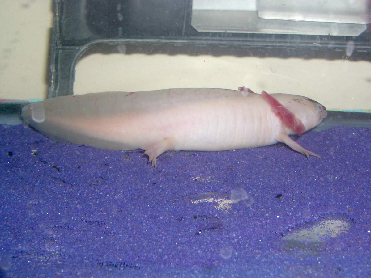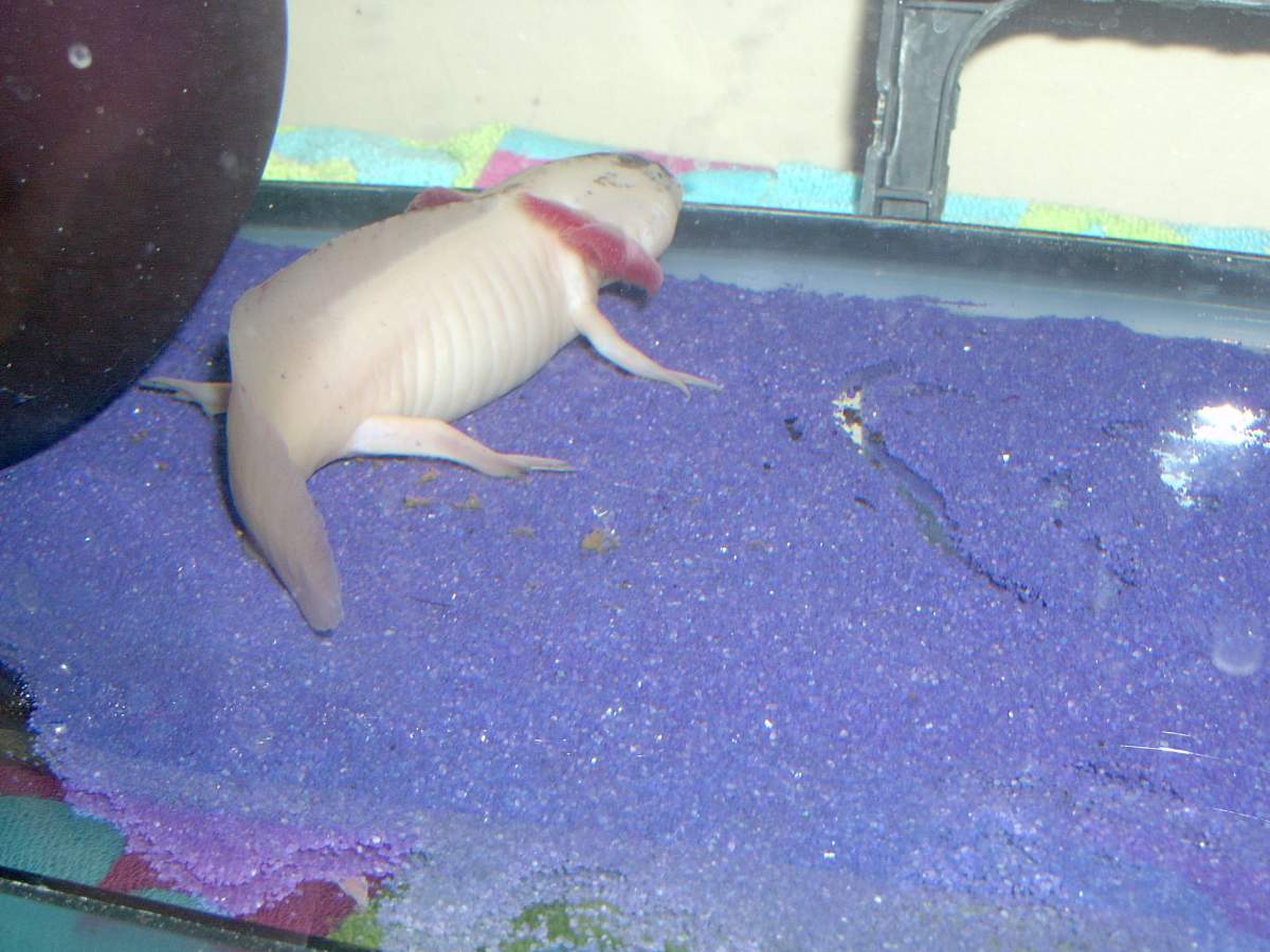 After everything was cleaned and not covered in purple goo I began to do a water change just to make sure all the yuck was gone. I removed all her decor from the tank and attempted to get Squish out so I could do a 100% water change. Squish had a huge panic attack which ended in a cut tail so I left her in there and just kept taking water out, putting water in, taking water out, putting water in along with trying to get most of the sand out, impossible to get all the sand out with her still in the tank. Eventually it seemed that all the disgusting-ness was getting out and I was beginning to relax and began to think maybe I could do this whole dorm room axolotl.