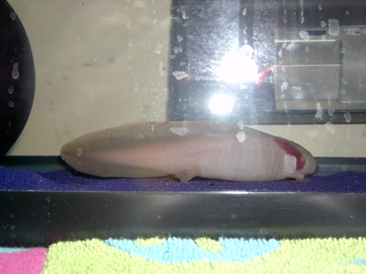 Woke up this morning, Squish was sitting on the bottom of her tank as usual, but her legs were all pointed in strange angles and she didn't appear to be moving at all. In true Kati fashion, I panicked and woke up everyone in the room to come look at her. She was very pale and there was seriously no movement. Her gills were not moving, she was not moving. I was terrified.