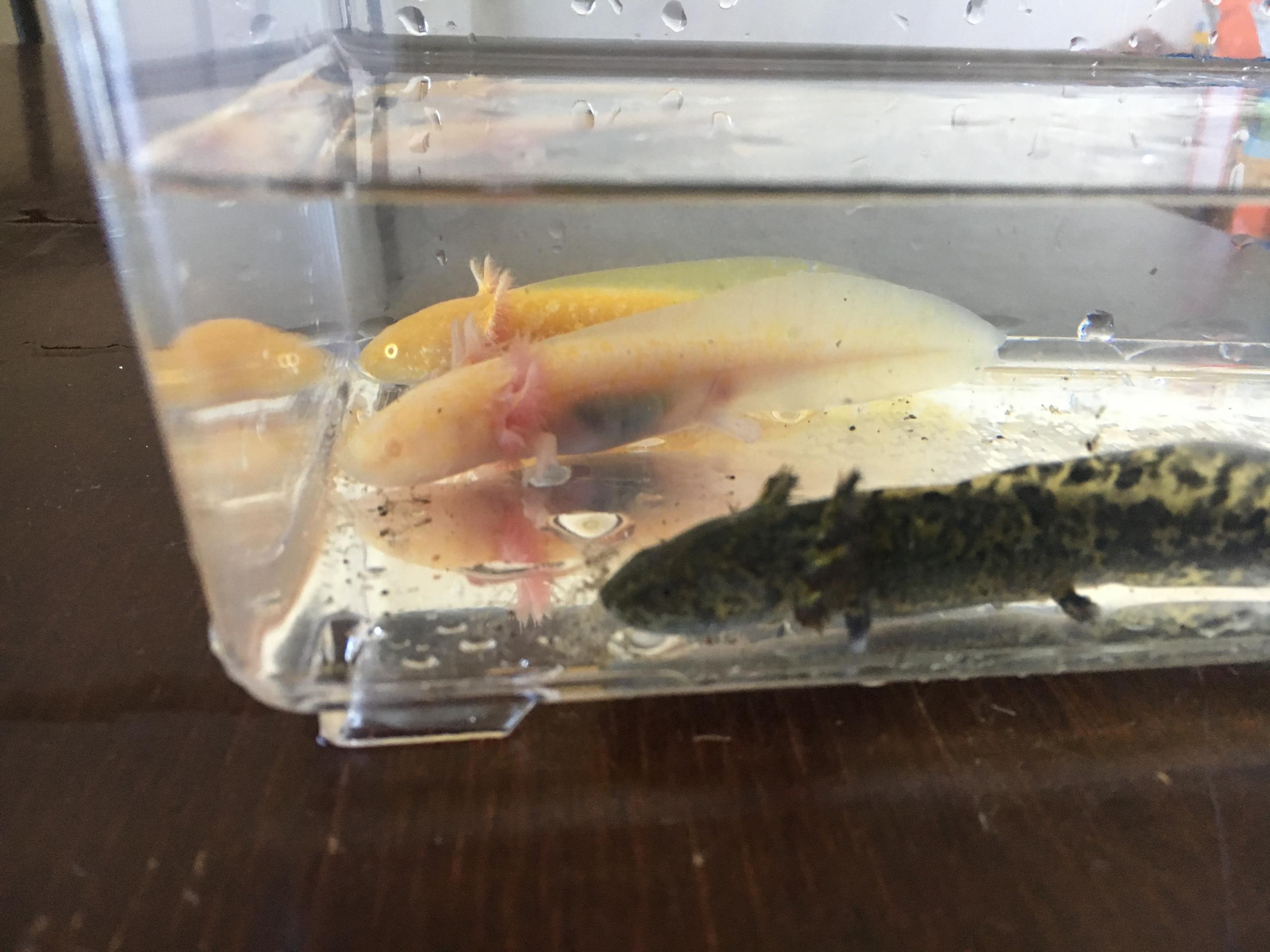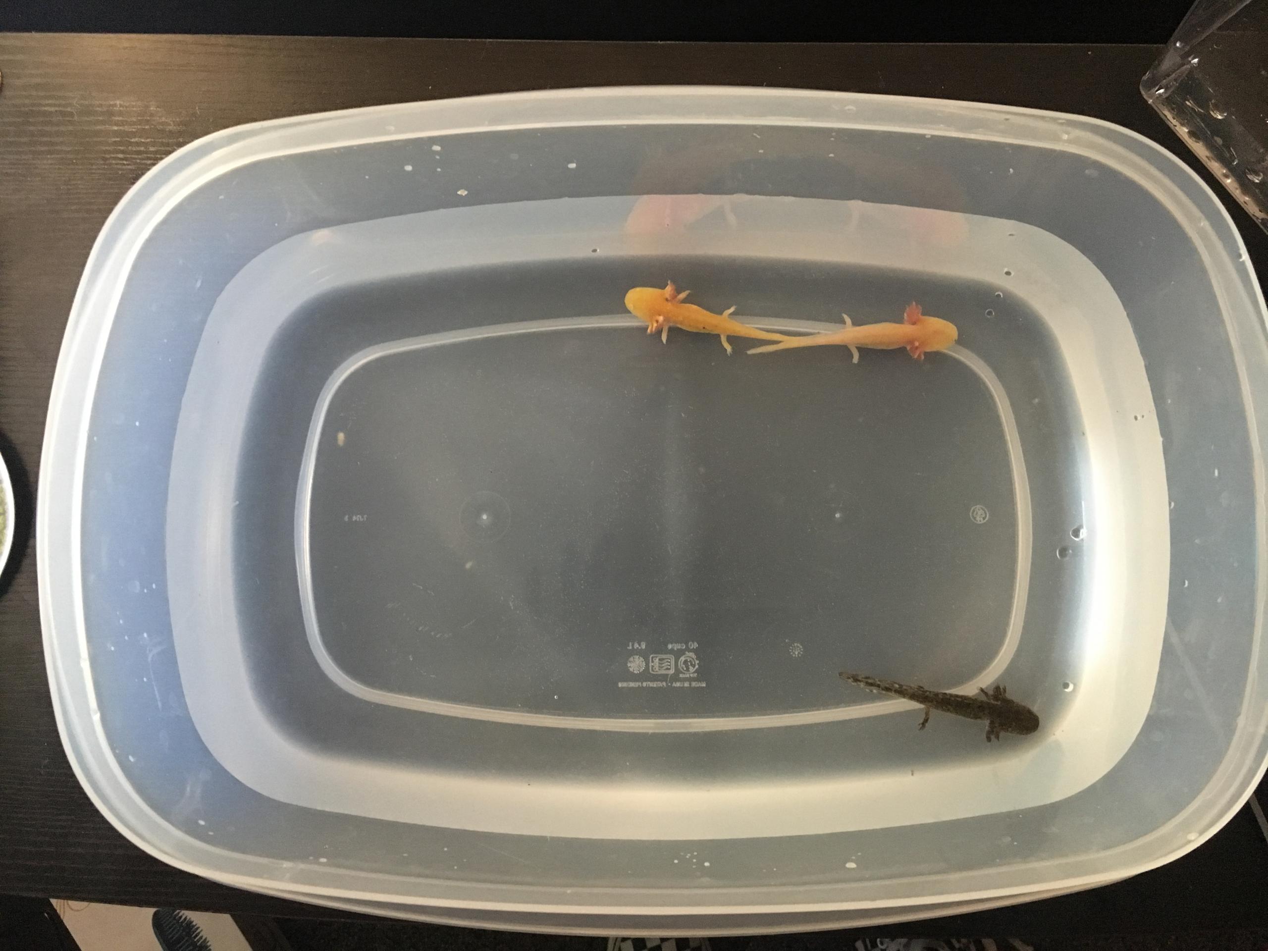 Hello! Two days ago I got three juvenile axolotls. They were born in late march so they are almost four months old and around 2-3 inches big. After first getting them, they were swimming around a bunch but over the past day they havent been moving around really at all unless to eat or sometimes just switchign to a different position. One of them is also floating around but seems to be okay. Is this normal? Currently, they are all being housed in a tubberware tub with water that has been treated with prime and is staying at 60-65 degrees. I've had no issues with them bullying each other or not eating. The tub also has 2 PVC pipes that they sometimes hang out in. They have beenn feeding on just frozen brine shrimp as both pet stores in my area are out of frozen blood worms (which is also what they were being fed up to me getting them) and any earthworms. I've been doing 100% water changes daily and feeding once in the morning and once at night. I havent been able to test the levels of the water as im getting a test kit from a friend who wont be back in town until Monday morning. Their tails are all straight and their gills arent curled, theyre just all lying in the same position which is worring me. I currently have a 40 gallon tank that im beginning to cycle before moving them in.