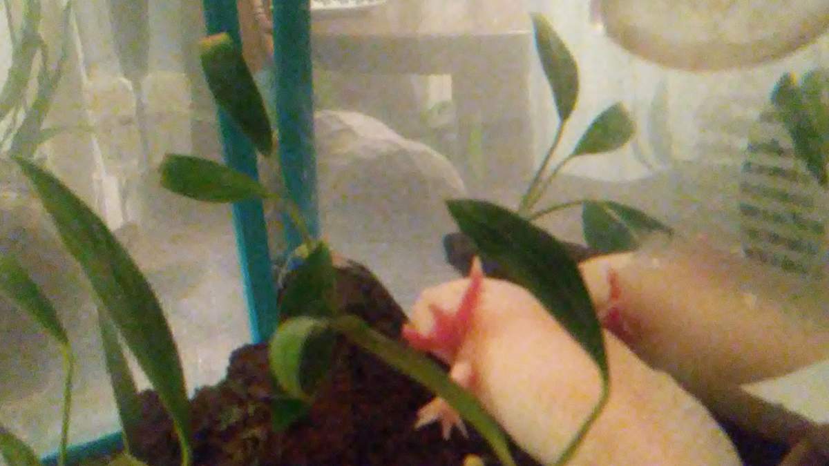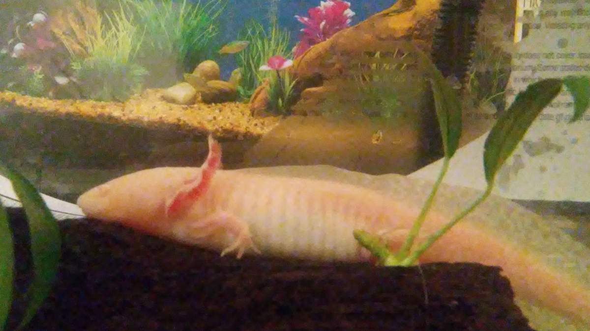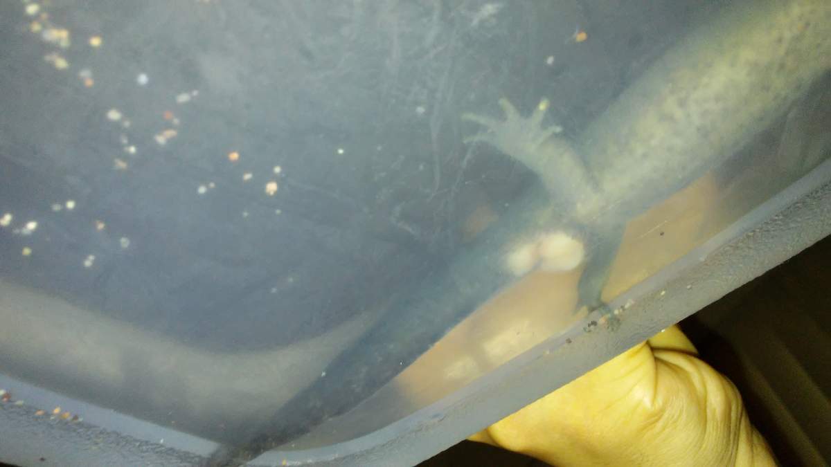 Yeah, sorry. I couldn't get great pictures of it, but it seems to be alright now. His cloaca is still a bit swollen, and that lump is still there albeit smaller, but he's not looking stressed at all. His appetite is still there, he's still attentive, his gills are either back or straight up, and he still makes his rounds about his living space.