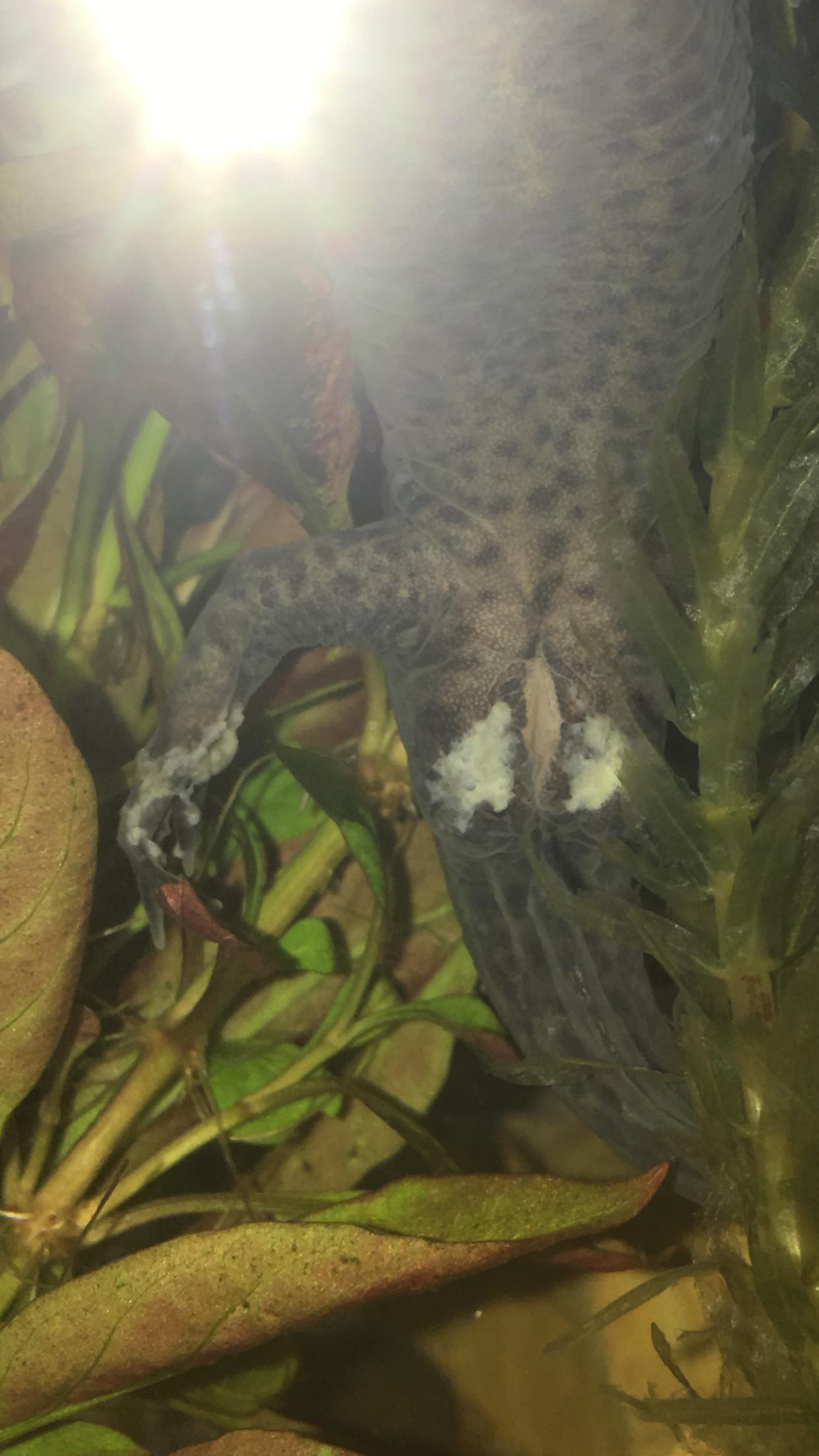 He has developed these two large lumps under his crotch area and immediately I assumed this was a swollen cloaca. However, his back feet seem to have gone all manky and covered in what I can only assume is dead skin?