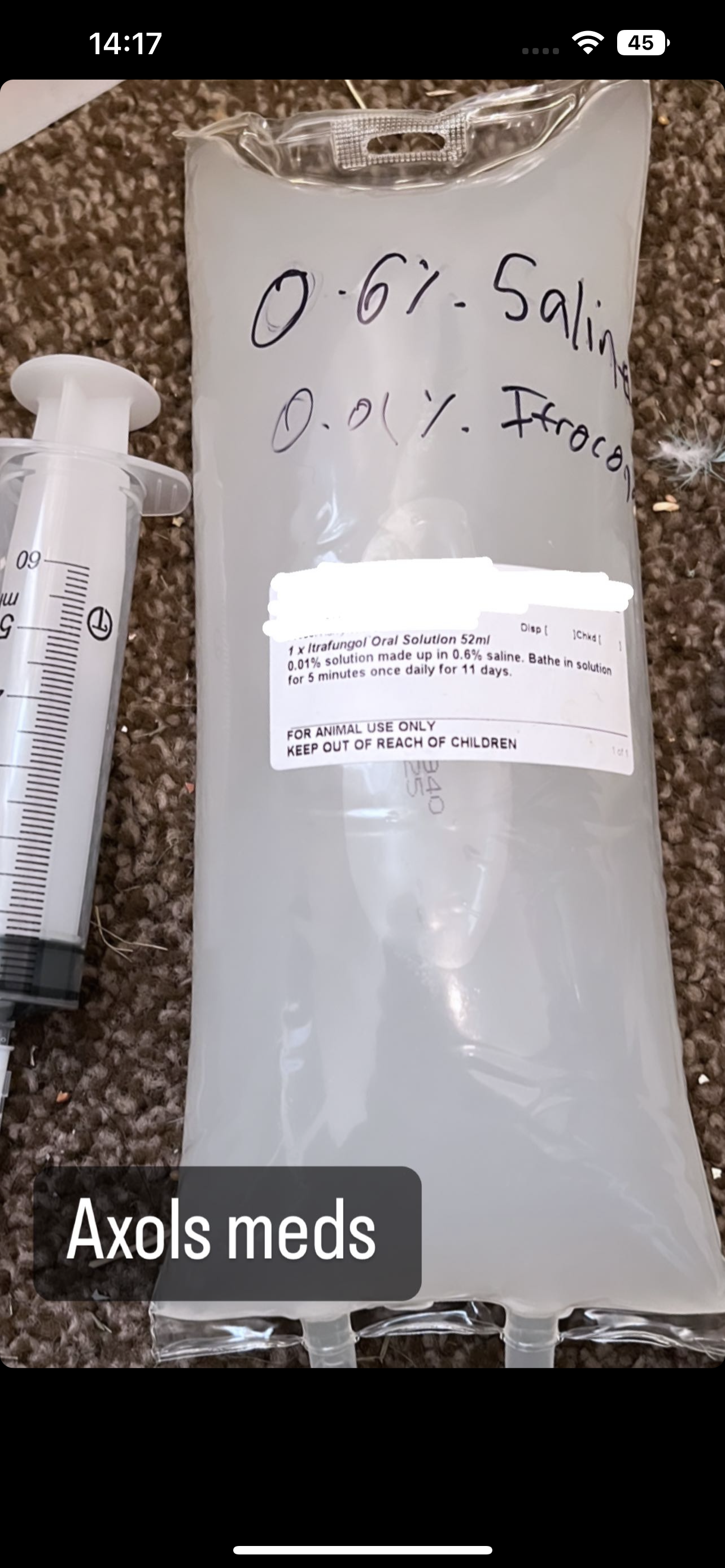 Turns out he’s got a fungal infection they looked at a bit of fluff off him and put it under a microscope and it’s fungus they’ve given me this to bath him in once a day for 11 days.. there making me up more as this won’t last me 11 days 😬 I’ve done one bath so far and back into his tub and allot of white fluff came out of his gills he’s moving allot more I’m putting him into another tub as so much fungus has came off him. I really hope it works as I had to pay for the full bottle of it as no other bottles were open 😬😂 it was really expensive but hopefully worth it! 🙏 photos are before treatment I’m going to upload photos after now too.