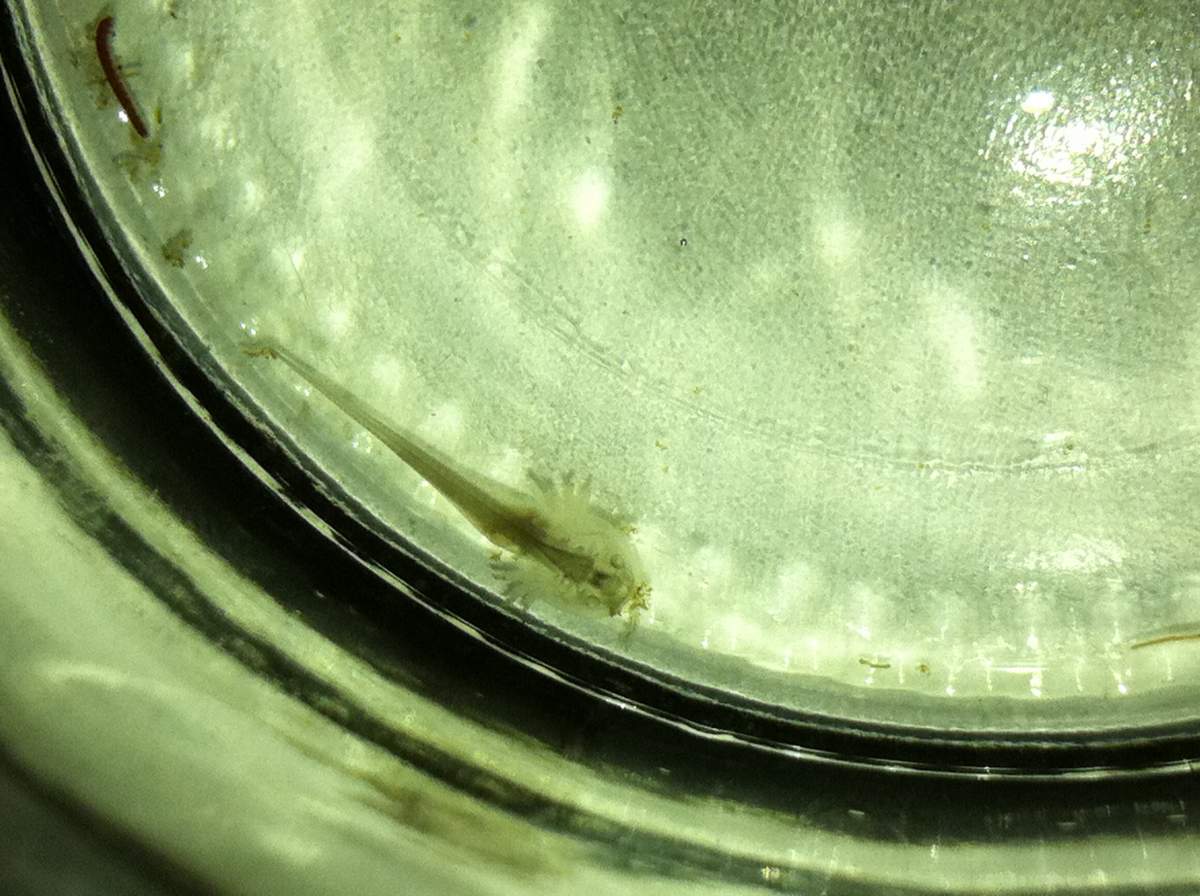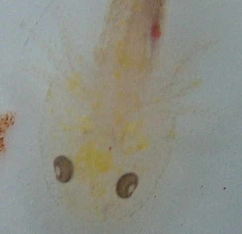 which leaves us with an axanthic melanoid albino which doesn't quite explain why it looks grey :confused: Perhaps because he is so transparent we're seeing the colour of the base and sides of the jar through him. The darker color down the middle of him looks to be mostly organs and cute little brain.