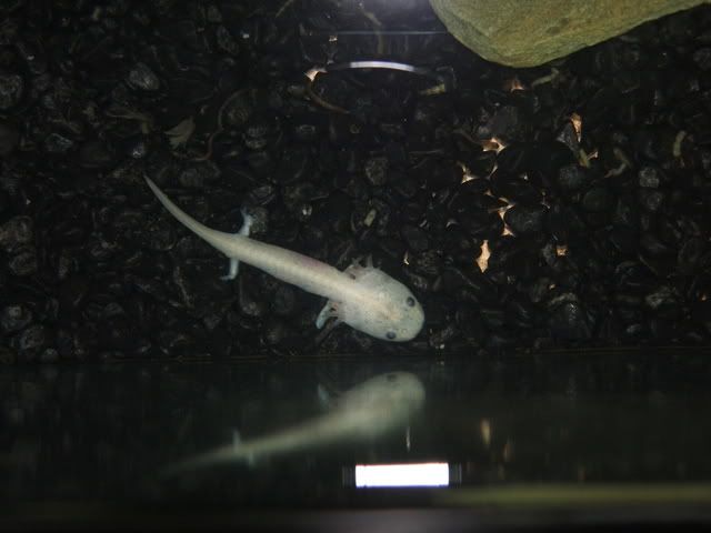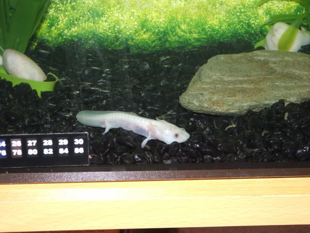 I agree with Ian that your little guy look very thin, and the temp is a bit to high. With regards to feeding he/she looks a little younger than my brood of 10..plus one that lost his tail( lost count of how many weeks old they are!they may be around 12 odd weeks old) The rear legs don't yet look fully developed. I currently feed mine on small cut up live earthworms and they are growing at an amazing rate. Prior to this it was live brine shrimp( well rinsed of salt) , daphnia and blood worm..these all need to be alive and not dried or frozen. Most fish/ pet shops will stock this..and the earthworms you could use out of the garden as long as its chemical free. If he was with his siblings he may have not had as much access to food, but now he has you he'll no doubt start feeding and putting on weight..mine are still fed twice a day and any access removed with a turky baster.