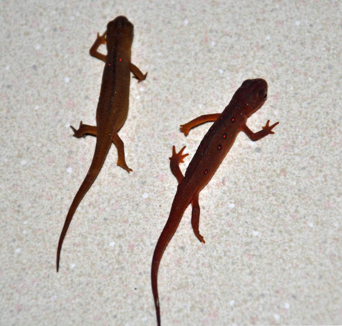 A few weeks back I had the pleasure of obtaining two Eastern Newts in their Terrestrial stage. I've been feeding them Pinhead crickets every 2 days and they are active and well. I know in their Aquatic stage the Newt will turn an Olive-Green-Brown colour and that's why I am making this post. One of my Eft's seems to be much more brown than the other. As you can see the Eft on the right is pretty vivid Red while the other is more of a Brown colour, is he turning Aquatic?