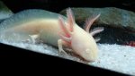 I think they are 3-4 months old (they're about 3.5 inches body length). They've definitely grown since I got them, and have little tummies now, too. Here are some photos I took yesterday while they were eating a bloodworm snack. They now get their main dinner (Repashy freshwater meat pie) from my fingers (which is pretty cool), then munch on bloodworm snacks for a bit. They're very active, and always hunting, but with those bellies I don't believe they're starving. They've been swimming a lot lately, too. Abe Sapien is the leucistic, Nessie Goldenhair is the golden albino. Nessie is developing a lot of those iridescent spots lately, and in certain lights they really flash.