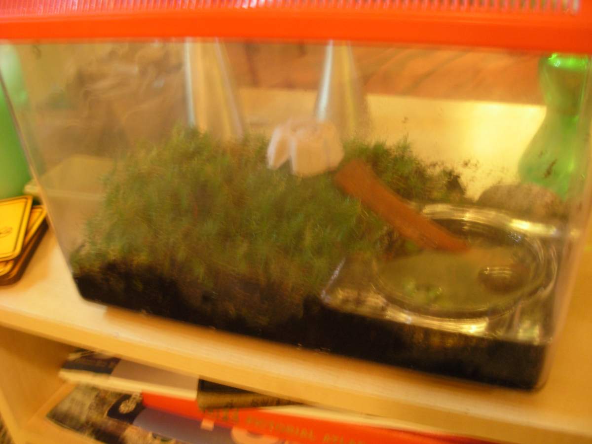 . I have him in a terrestrial setup with irish moss and a water dish, misted once a day. I think he's a bit on the thin side, but not emaciated yet. I've read that sometimes new morphs won't eat, but I"m going on vacation next week and would like to get him eating nice for the babysitter before i go.
