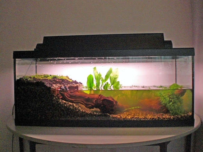 Nice setup, though. Simple but effective. My only suggestion would be to add some cover to the land area. You could do this with a simple piece of cork bark or terracotta pot. If your adventurous a small terrestial plant.