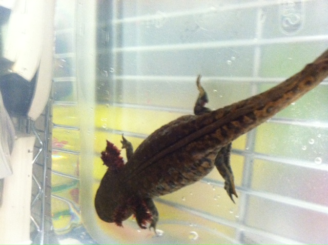 First, a story. I've been going to a pet store for a while that I found fed feeder fish to their axies (not quarantined, right from shipped in stock), had large pebbles in the tank of a size that could be eaten along with weirdly sharp small shells, and all of the axolotls had been kept together since being 3 months of age, naturally causing many injuries in their tank. One wild type had no gills on the right side. Never saw it healed. I informed them many times of their neglect, but they ignored me as the person who takes care of them owns axolotls herself. I informed the girl who claimed to know all about them and she ignored me. After going many times and finding they hadn't fixed it, I went to the managers and told them they were likely to lose their stock if they didn't stop neglecting their animals. If not for the sake of the poor things, at least do it to save their sorry butts some money. Today I went in and it was all fixed. I was so happy. So I bought the only Anderson's salamander they had for 90$, and found that she was female. She's a perfect mate for my male andersoni. So, Penelope Cruz is to be with Enrique Anthony once she gets out of quarantine.
