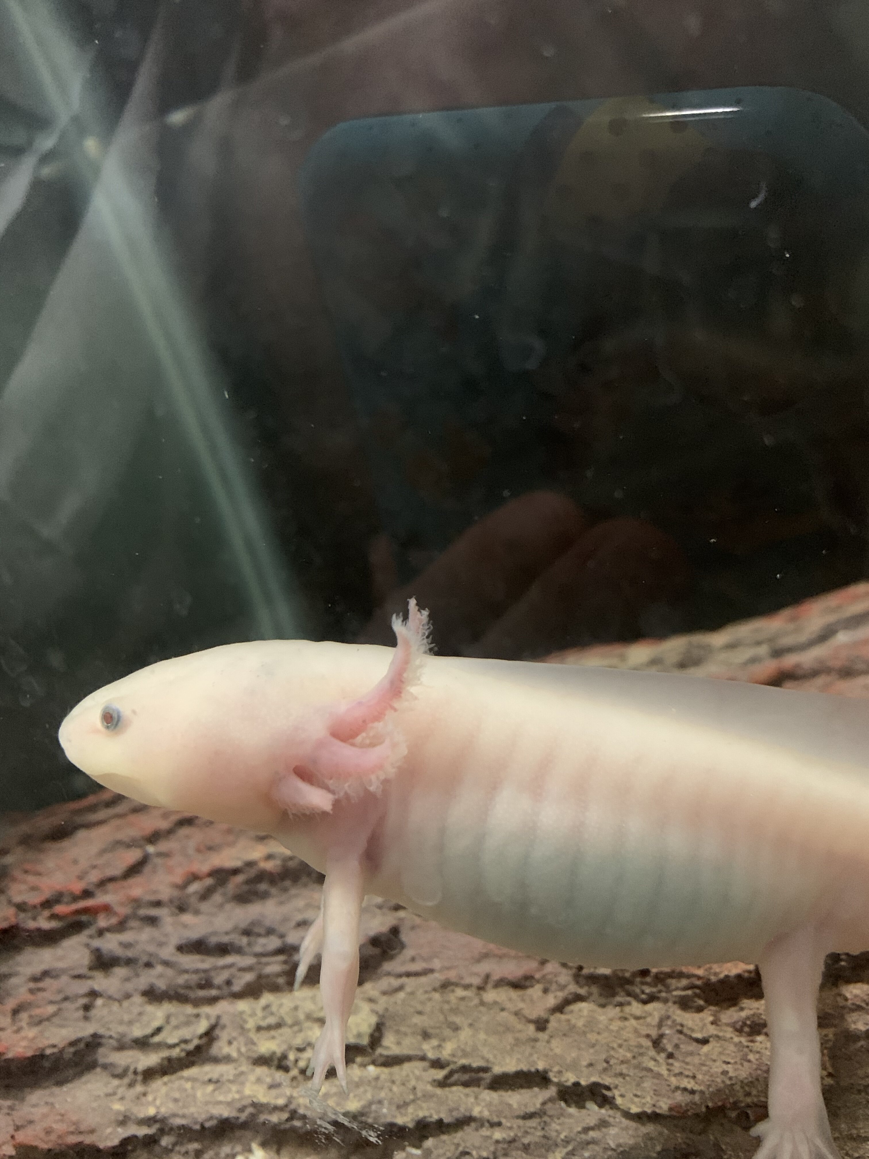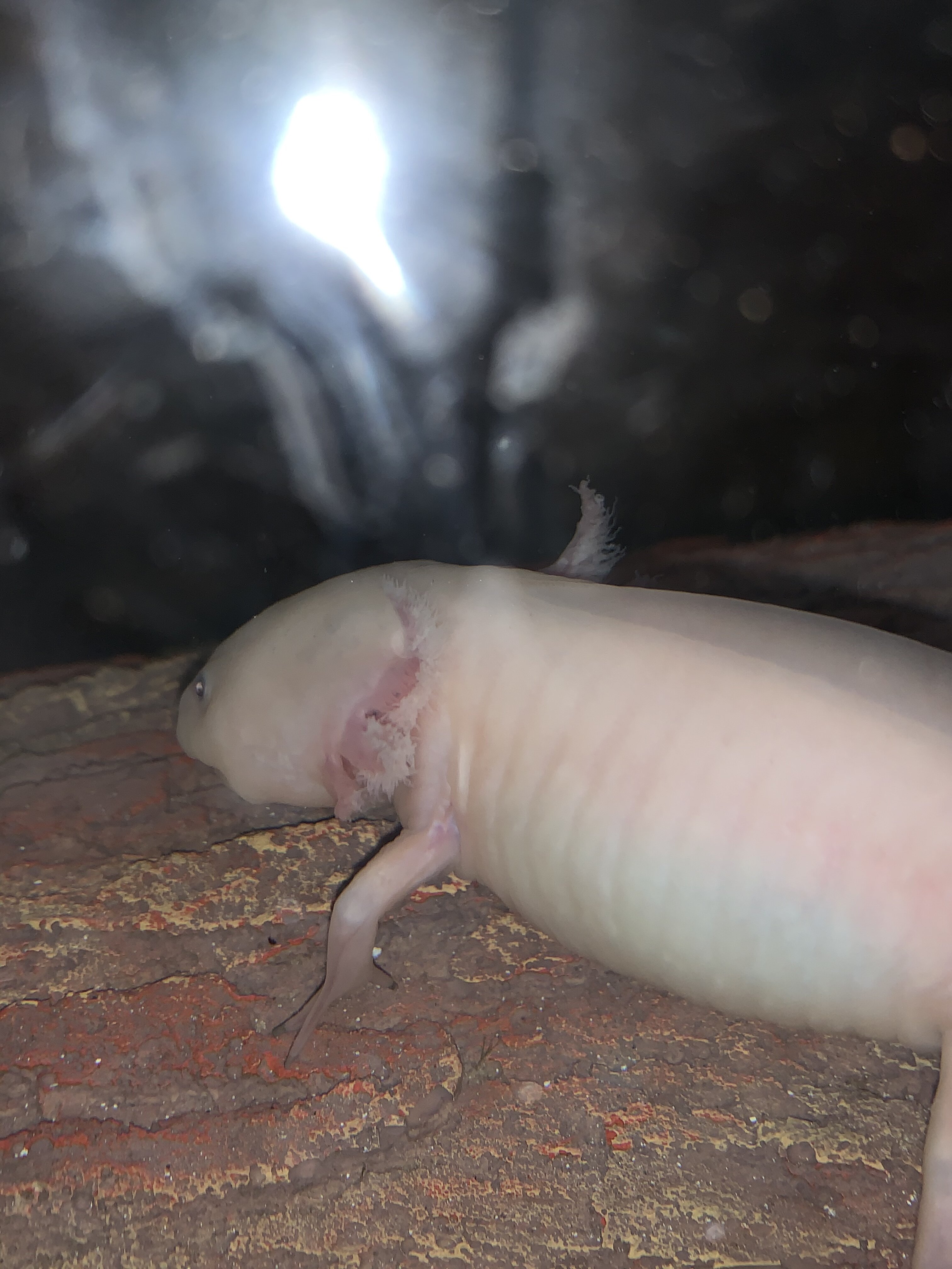 I don’t know what’s going on. My axie seems to be loosing her gills. I didn’t really notice until today, but looking at before pictures, I’m shocked. The first picture is from April 13th, the next are all from today. Her gills are pale, stringy, and looking much more bare. I’m not sure why. I checked her tank parameters with my Mastertest kit and for 0 amm 0 nitrite and 20 nitrate. Temperature has stayed between 62-68 this week. She is eating just as voraciously and is active and moving around. She may have thrown up her food yesterday though. I found three brown circles I thought was poop at first as she has been pooping more frequently lately, but now I’m thinking it might be undigested pellets (I feed her Hikari carnivore pellets). The only thing that is new to her tank is yesterday I put in a a new decoration (pvc pipe siliconed black and covered in gravel that I let cure for 24 hours)