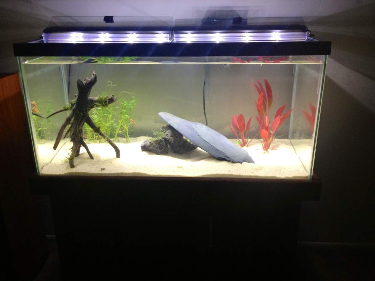 Here's my new tank setup for Artemis Popcorn (juvenile albino) until he/she is big enough to live with the much bigger Pepito without getting eaten! Hubby called it the crystal palace. She had an air bubble yesterday so I put in the jars so she could stay at thes surface with a resting spot. As you can see, she has gotten over it nicely!