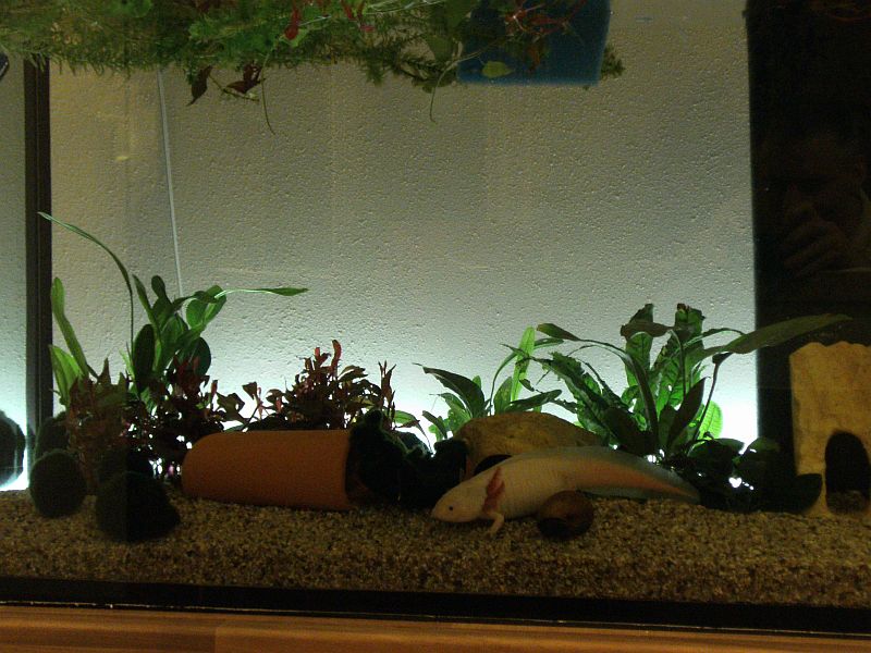 My new 5ft fish tank, homed to 4 happy axolotls, still sorting out some teething problems, like the floating plant :\, it doesn't want to stay on the ground![]()