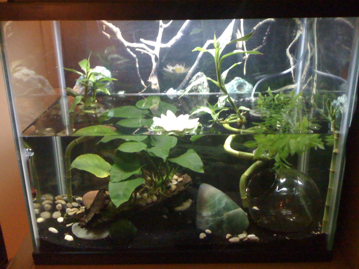 Here's mine from start to present! 25 gallon (tall) with a sponge filter. I just finished this a half hour ago. Marty, the goldfish, is just in there to reassure me that the water quality is on par (not that I haven't tested it obsessively every time I move something...). He'll move back to his tank when I take Snuffles out of the fridge tomorrow :D