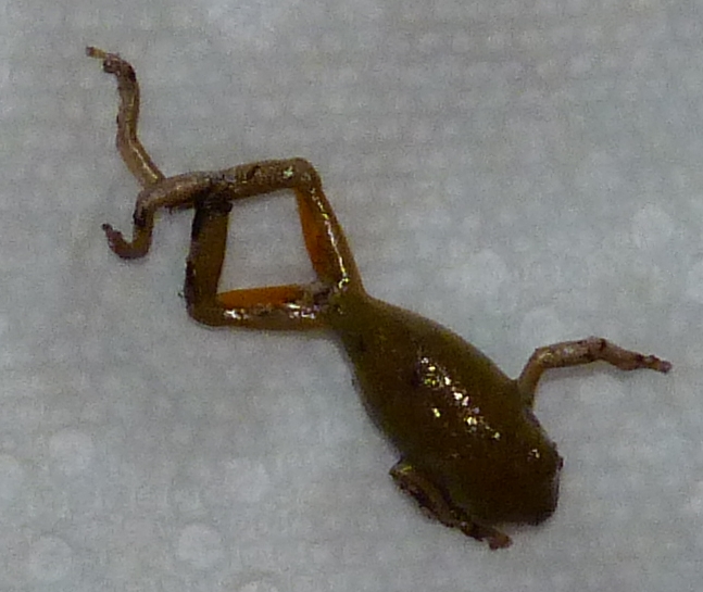 Here's an image of the deceased little frog. The change over two days is dramatic. He was at least a millimeter to two millimeters plumper on either side and on top, and had rich dark greens, browns and grays on his back. Now he's a pale, "pea" green and so much thinner.
