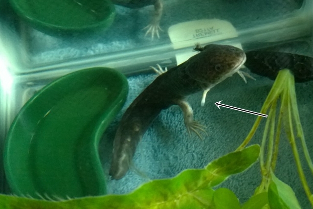 Advice needed on injured axo (prior posts 6/22, 6/25, 6/27): Gandalf the Grey is doing well, he remains separated from his brother, in a shallow tank, his limb looks clean but I do not see any growth, I continue to do daily water changes plus a touch of furan-2 and a guava leaf, tank temp ~66, he is eating more regularly now, the nightcrawler worms were too thick for him so I switched to trout worms, he poos every 2 days or so, questions: