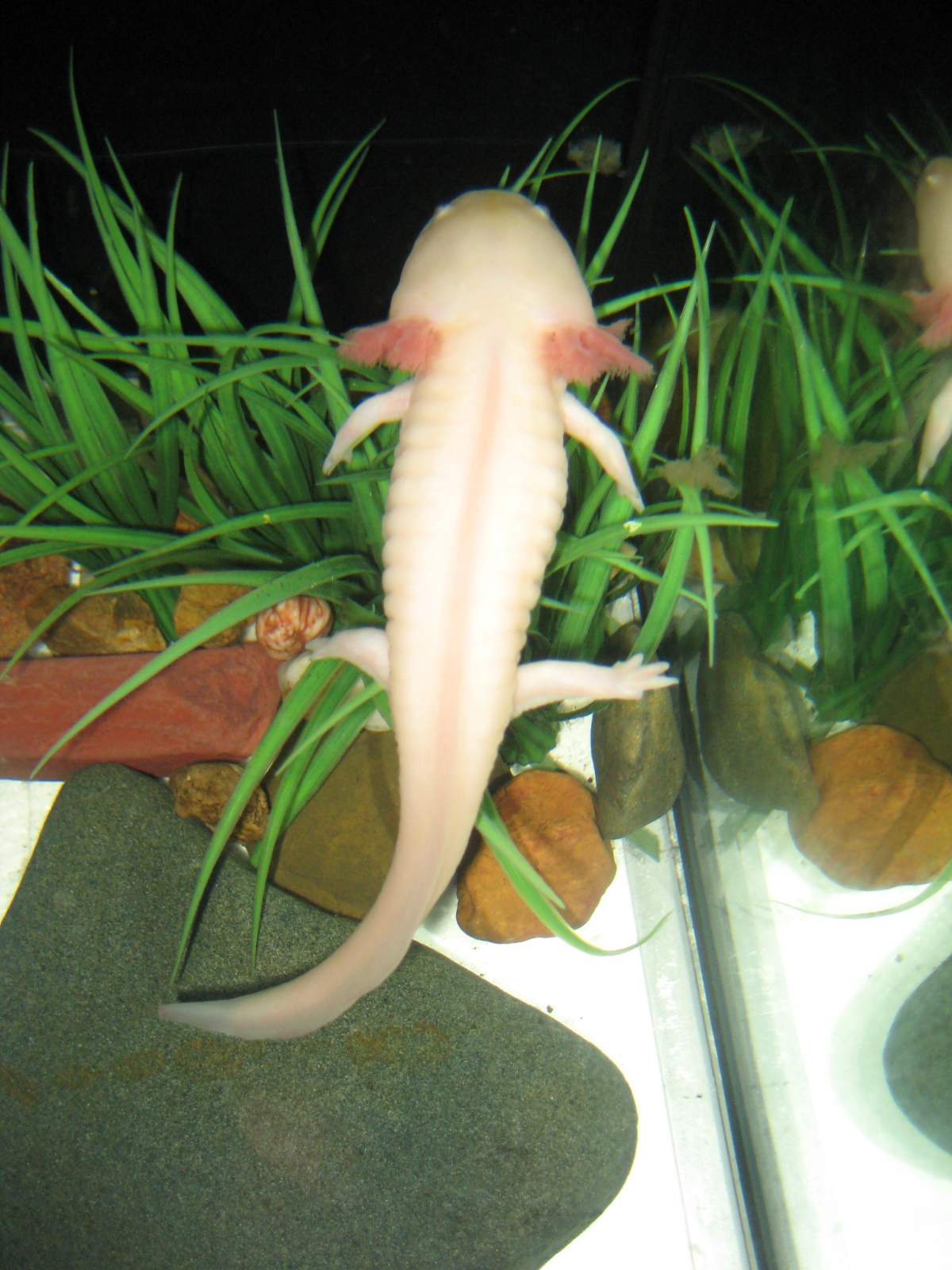 Well, i just joined today and wanted to share my guy. We adopted him few months ago from a kid off of craigslist who said he was moving and needed to find him a home. I did lots of research and set up a tank and when we got there I was appalled at what we saw. He had other fish almost his size in the tank and there was a heater in the tank and he was feeding him flakes. Oh, boy. We got him home and he seems so much happier. His gill feathers were almost not there at all and have started to grow in the last few months, and his tail is growing. however, his toes are not growing back and his feet are little stumps for the most part.