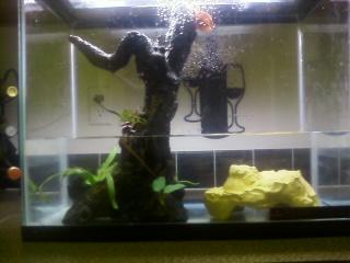 this is my tank for my newt, its has like 8-10 inches of water, a place to go under for darkness, and it goes up and chills on the log when it is tired of swimming.