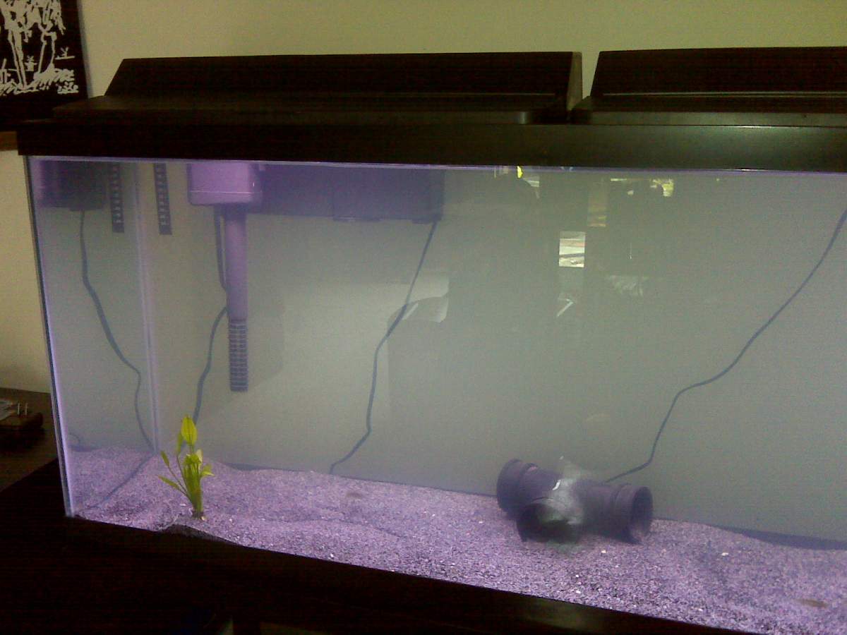 After washing the sand, I have now added water, plants and 5 zebra danios. I had some plants from a couple of weeks ago that I tried to keep alive - so I placed them in the tank. Could their decaying state be the reason the tank got a bit cloudy after one day? I took them out and got another plant (one you see in the picture). --- My question regarding this is; I will be getting some java moss and others recommended at this forum and other ornaments (like four or five)... so will they affect the cycling since I am adding them later this week?