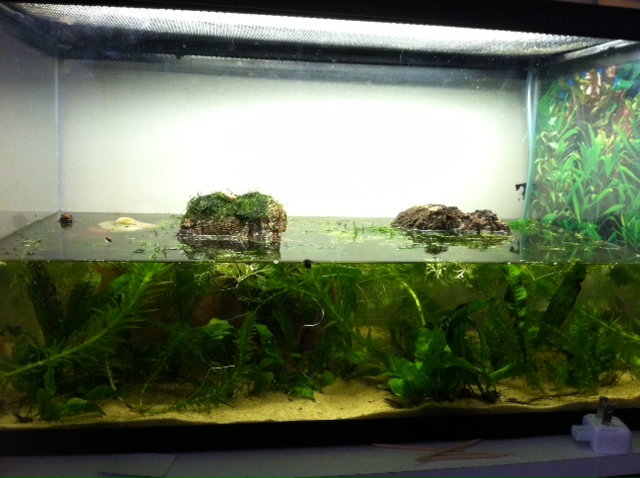 Quick Update: It has been spending quite an amount of time underwater w/o me having to do anything to get it in the water. Its been completely underwater for the past few days, besides when it comes out on land at like 1am. I added some more plants and java moss. The T. verr of course, decided it wanted to eat right when I ran out of worms, so its been hungry for a couple days. And I just found out that Walmart is selling Baby Nightcrawlers so I just have to cut those in half and feed them. The T. verr usually gets the lightly colored end, and the P. waltl get the darker half.