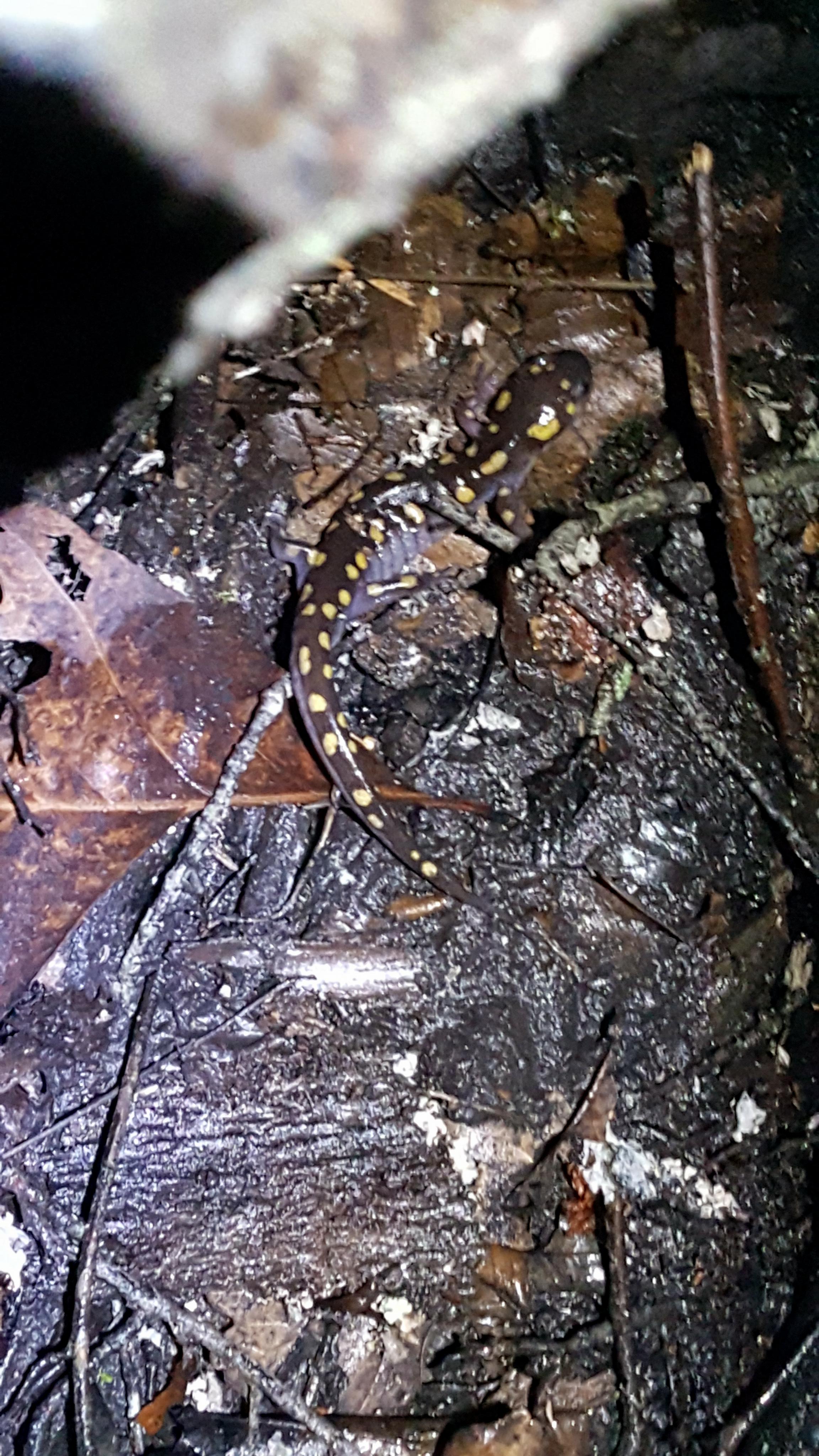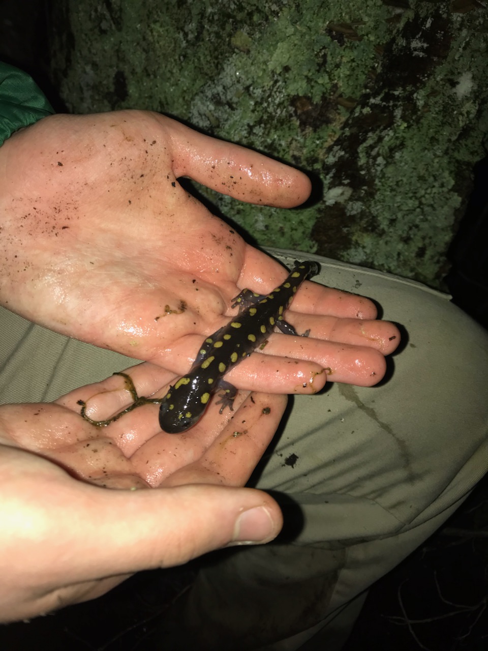 Two spotted salamanders found swimming in algae inside the pool. We didn't find any egg masses.
