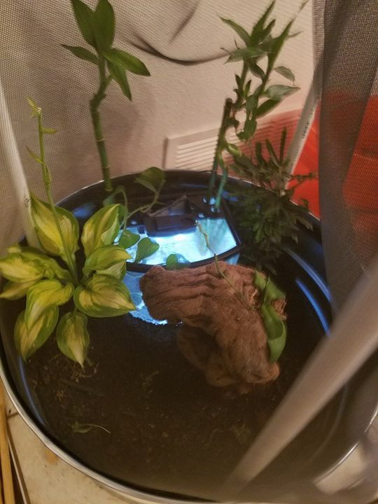 New vivarium setup. It's about three feet diameter round galvanized tub with a layer of rocks soil and moss. There are a few plants and a half covered fish tank that will be inaccessible to other critters. It is sealed with screen and velcro. Let me know if anyone has opinions or advice for making this a newt enclosure.