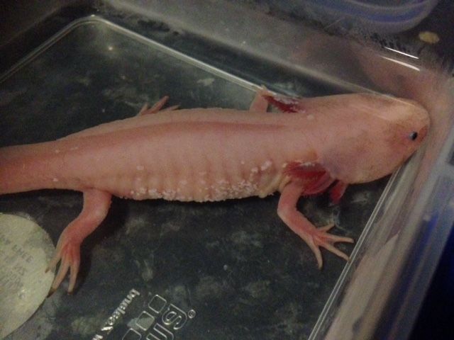 Hi, I found some white fungus growing on my two axolotls and so I have put them in the fridge and I have been giving them salt baths twice daily. This has been for about three days now. However, when bathing them today i found the white on their bodies had gotten worse. Is this just a reaction to the salt? Do I need to be worried? What do I do? Please help me!
