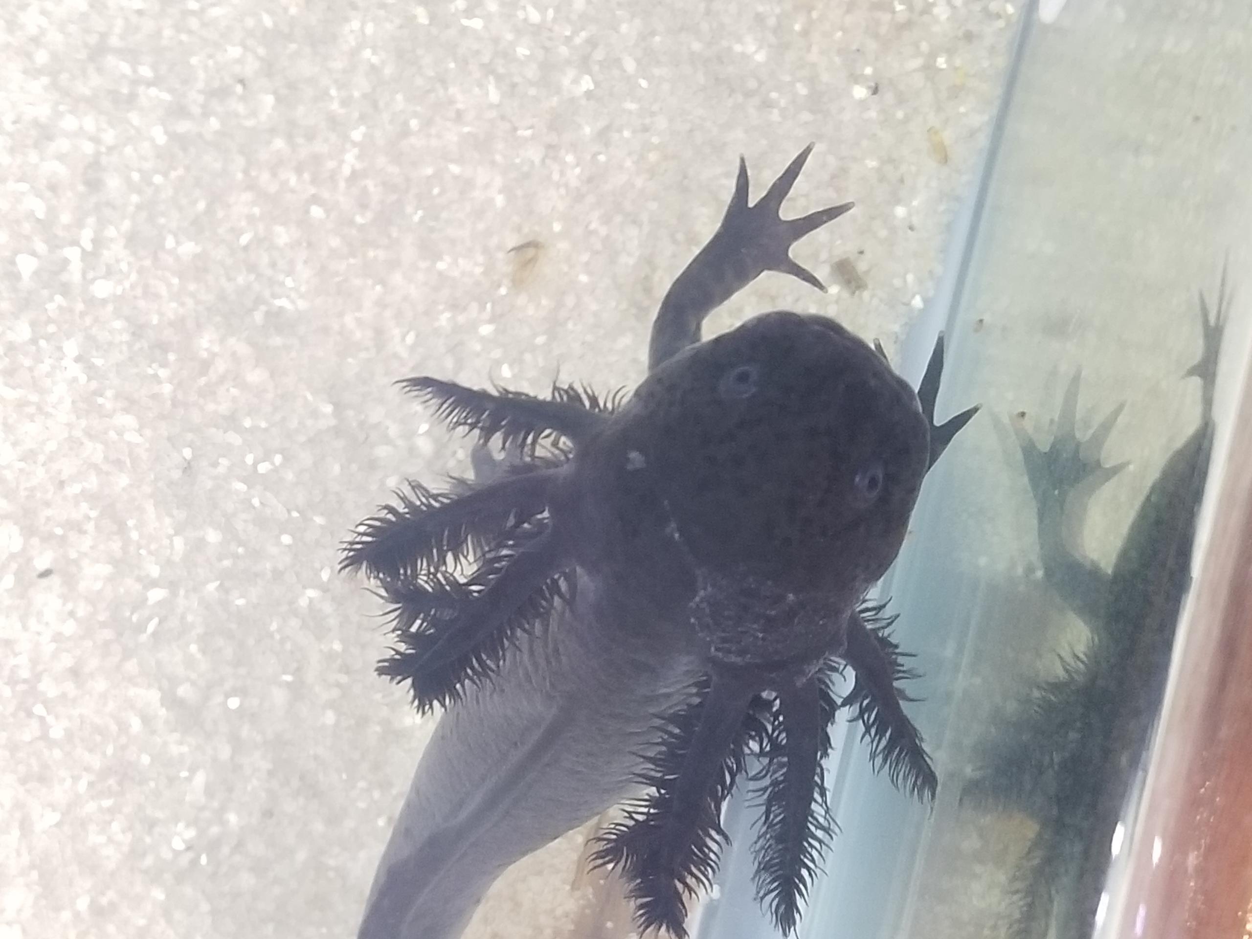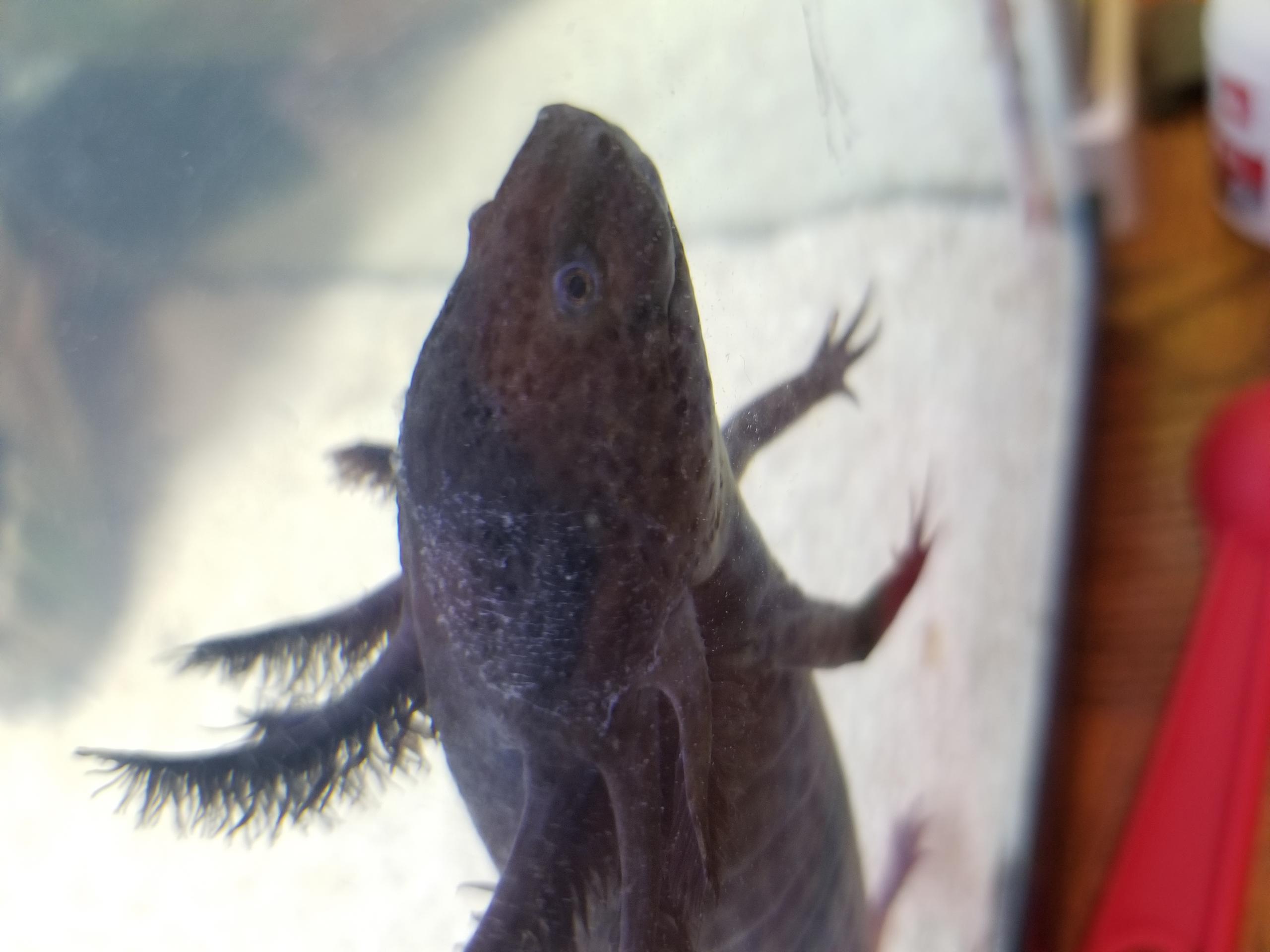 He lives in a 40gal tank with one other axolotl. They are 8 months old and I've owned them since they were a few weeks old. Water stays around 65-70 F but I've had continuous trouble with their water quality. PH seems to hang around the low side (6.5) and nitrites tend to be high(cycle crash? Not sure why this is). They eat about 3-4 times a week (red wigglers, pellets, blood worms, dubias). I will check water parameters again when I get home.