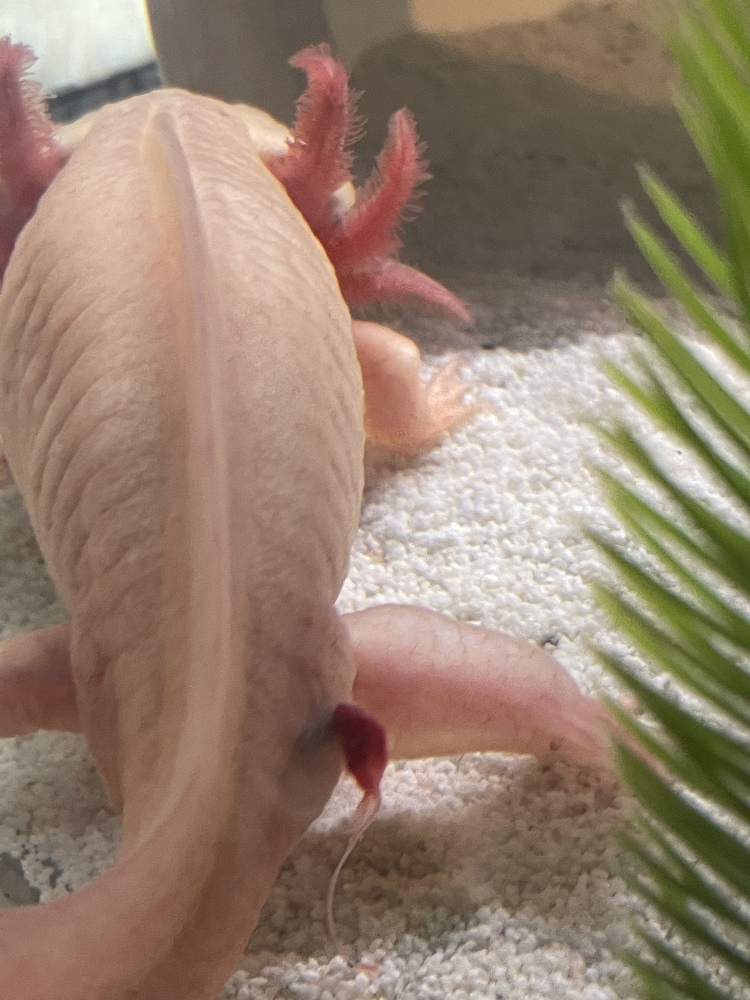 Over past two weeks my three year old axolotl was active and eating regularly (frozen blood worms and red wigglers). Several days ago it vomited up much of what it had eaten. After 24 hours it seemed fine and was again active and moving around as it regularly does though i noticed that its cloaca seemed swollen. Yesterday when checking the tank I found it had swollen back legs and a swollen open wound on one side (see picture). It was openly bleeding quite a bit from the wound. I have fridged it and that seems to have helped slow the swelling and the loss of blood. The perimeters of the water in the tank is good with no nitrite, nitrate or ammonia blooms. The only substrate is sand so I don't know what obstruction there could be. I have found an emergency vet who sees axolotls but they are not open until tomorrow but said they might be able to get us in. Does any one have any advice about what the problem might be or have you experienced this before??? I'm worried he might not make it. Any help would be appreciated!!