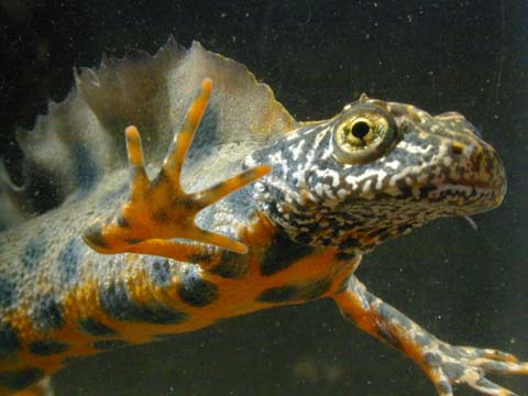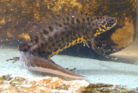 The crested newts are the largest (to 18cm) and most heavily built newts of the genus Triturus. They have a warty skin, quite unlike the smooth or granular skin of the smaller species. The back is dark brown or black, and there may be white stippling along the flanks. The belly is usually yellow or orange, with large black blotches or spots. The males develop a high, toothed, black crest during the breeding season, and a white band along each side of the tail.