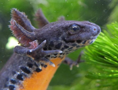 Neotenous female Triturus (=Mesotriton, Ichthyosaura) alpestris. Photo by Will Atkins.